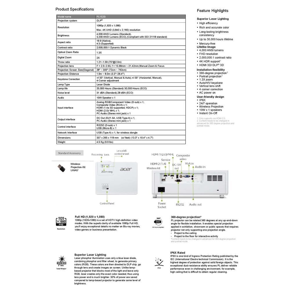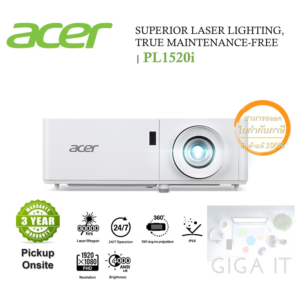 ACER Projector รุ่น PL1520i (Laser / 4,000 lm / 1080p) ประกันศูนย์ Acer Thailand 3 ปี (Pickup Onsite Service)