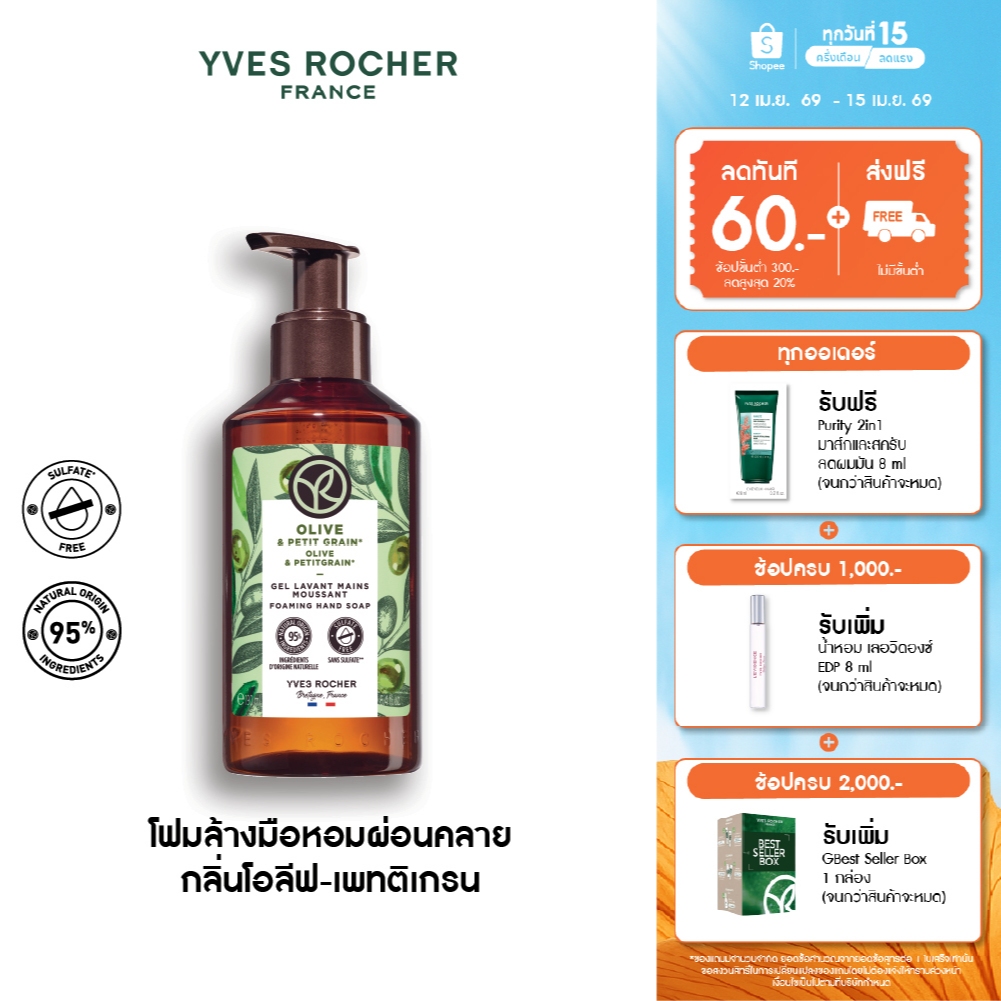 อีฟ โรเช Yves Rocher Olive & Petitgrain Foaming Hand Soap 190 มล.โฟมล้างมือ กลิ่นโอลีฟ-เพทติเกรน หมดปัญหาผิวแห้งกร้าน