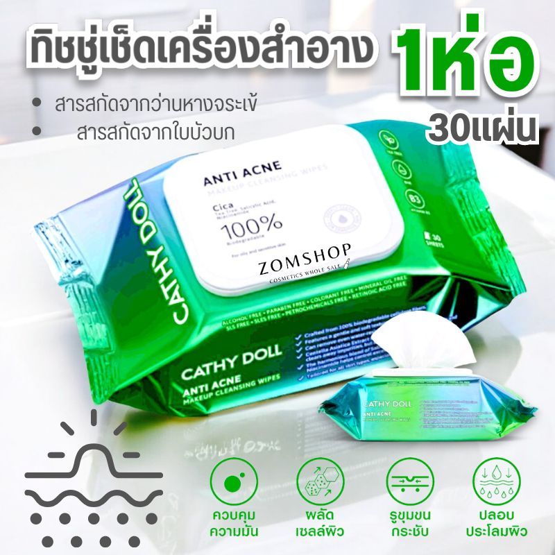 1ห่อ【ใบบัวบก】ทิชชู่เช็ดเครื่องสำอาง【ห่อ/30แผ่น】Cathy Doll Anti Acne Makeup Cleansing Wipes 30Sheets