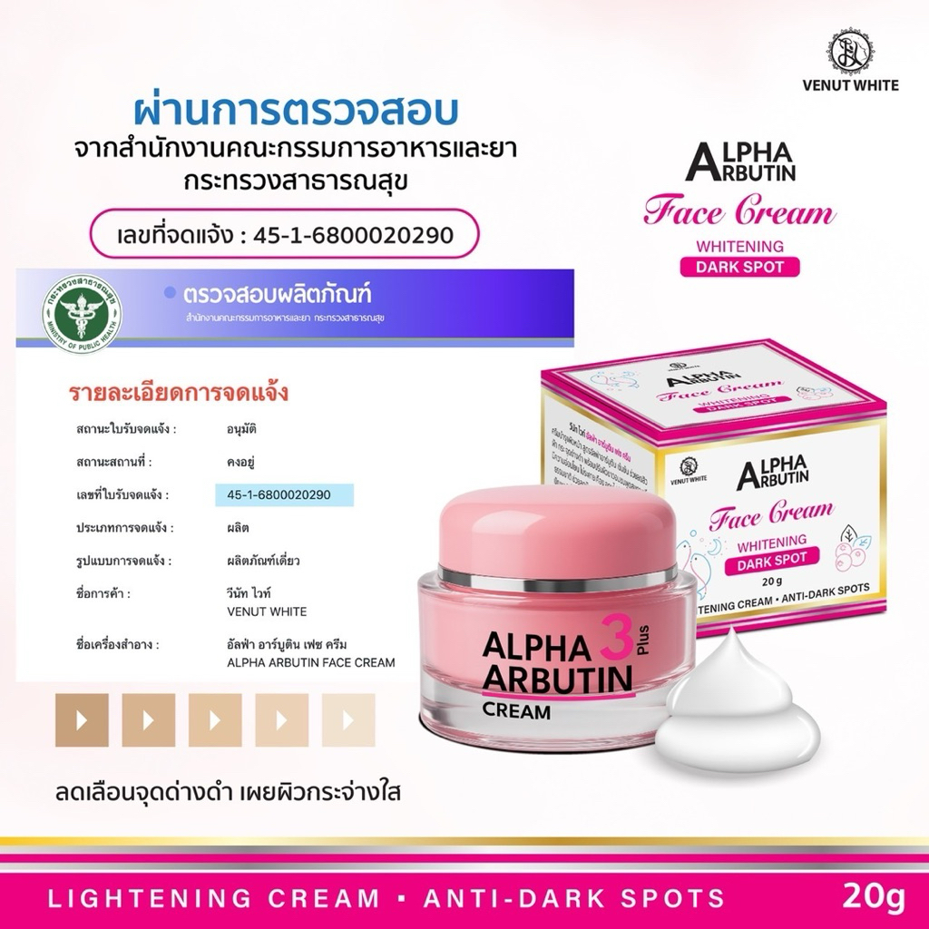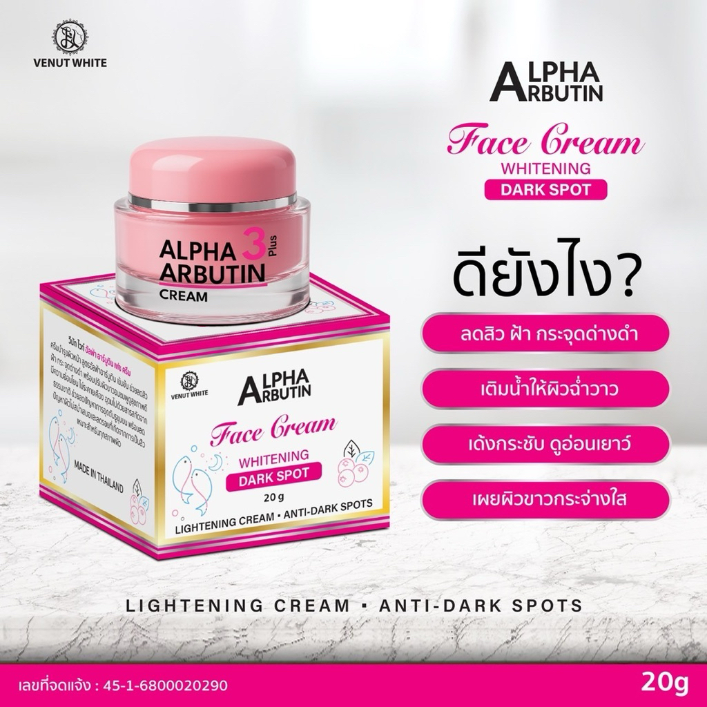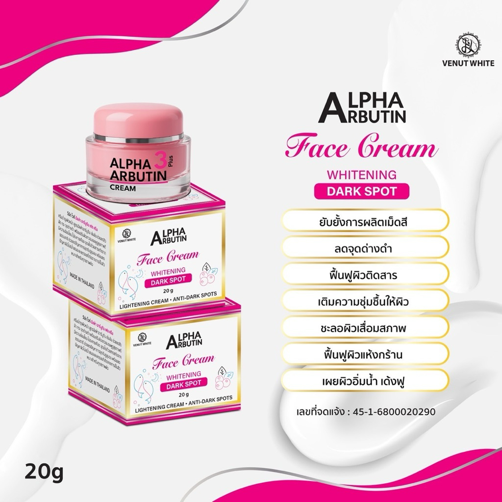 Venut White Alpha Arbutin Face Cream วีนัท ไวท์ อัลฟ่า อาร์บูติน เฟซ ครีม 20g.