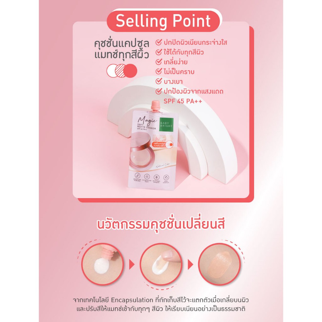 (1 ซอง) คุชชั่นแคปซูลแมททุกสีผิว เบบี้ไบร์ท Baby Bright Magic Soft Matte Cushion SPF 45 PA++