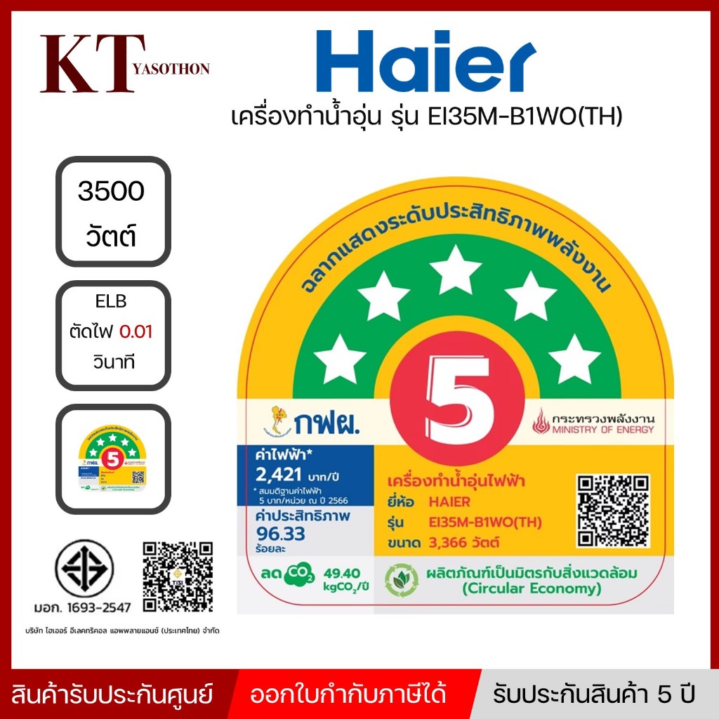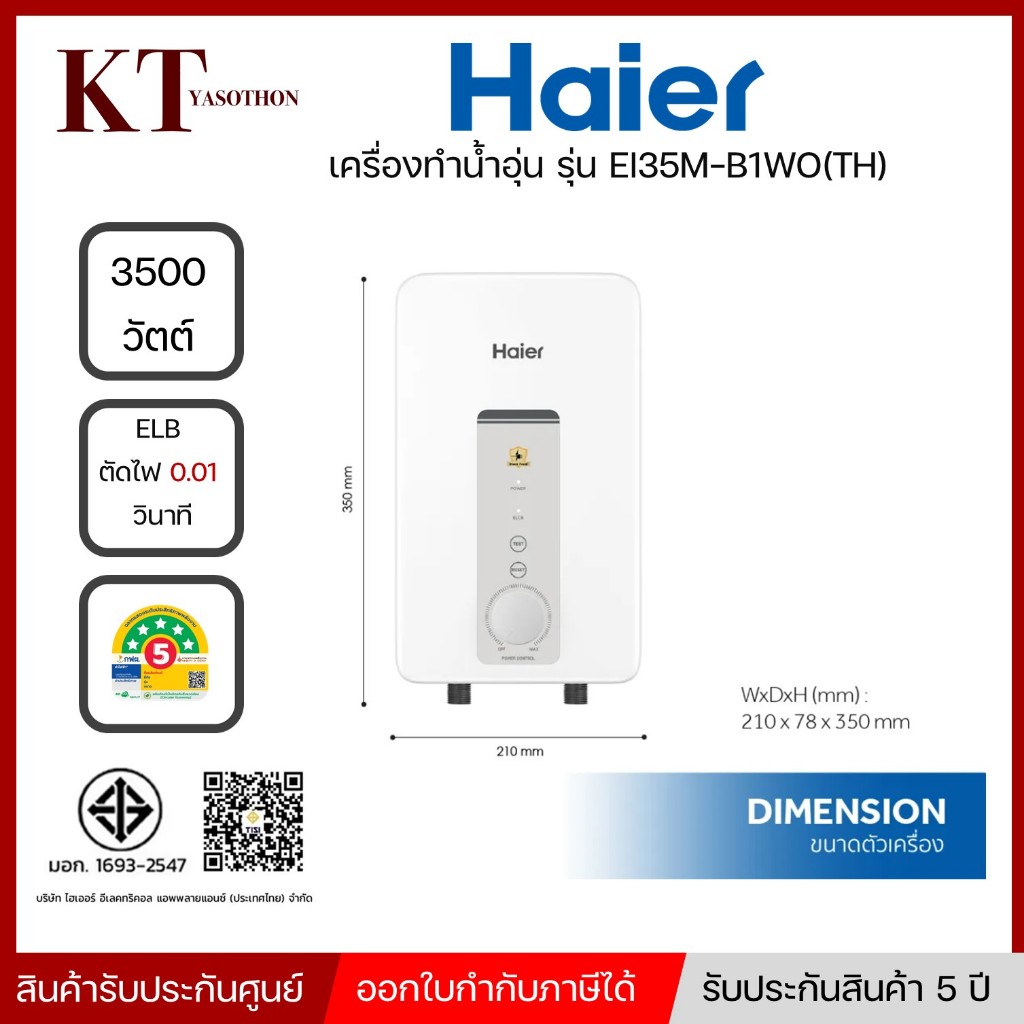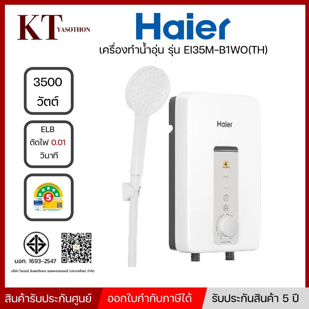 รุ่นใหม่ Haier เครื่องทำน้ำอุ่น กำลังไฟ 3500 วัตต์ รุ่น EI35M-B1WO(TH)