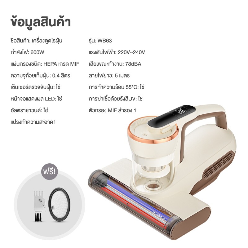 Jimmy WB63 เครื่องดูดไรฝุ่น แบบมีสาย แสง UV ฆ่าเชื้อ ระบบลมร้อน เซ็นเซอร์ตรวจจับไรฝุ่นได้ รับประกัน 2 ปี