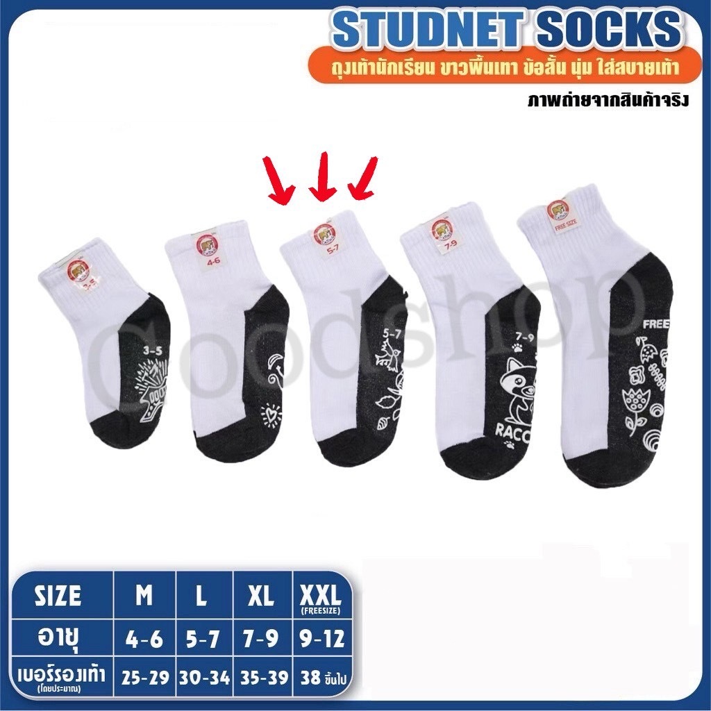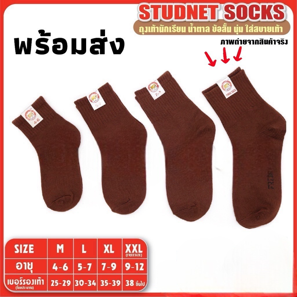 [แพ็ค 12 คู่] ถุงเท้านักเรียนเด็ก มีกันลื่น ผ้าหนานุ่ม ใส่สบาย สีขาวพื้นเทา / น้ำตาล ขนาด 5-7 /ฟรีไซส์