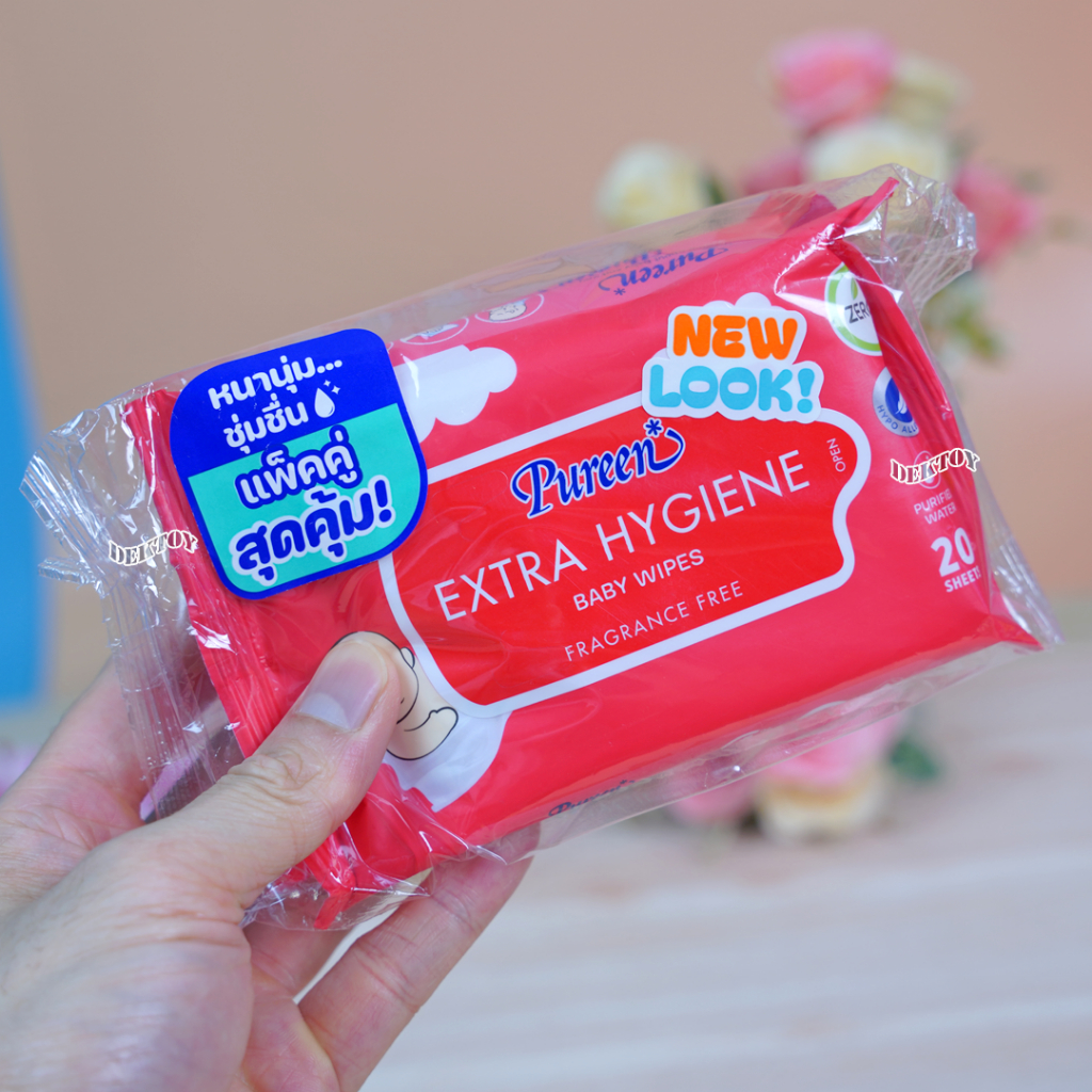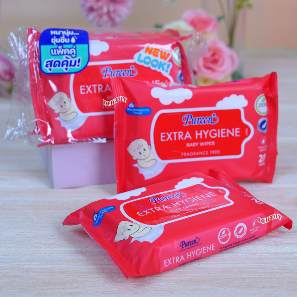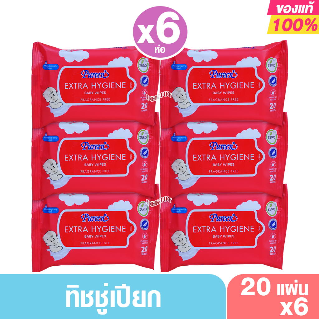 6 ห่อ Pureen เพียวรีน ทิชชู่เปียก เบบี้ไวพส์ ผ้าเช็ดทำความสะอาดผิว สูตรเอ็กซ์ตร้า ไฮจีน 20 ชิ้น