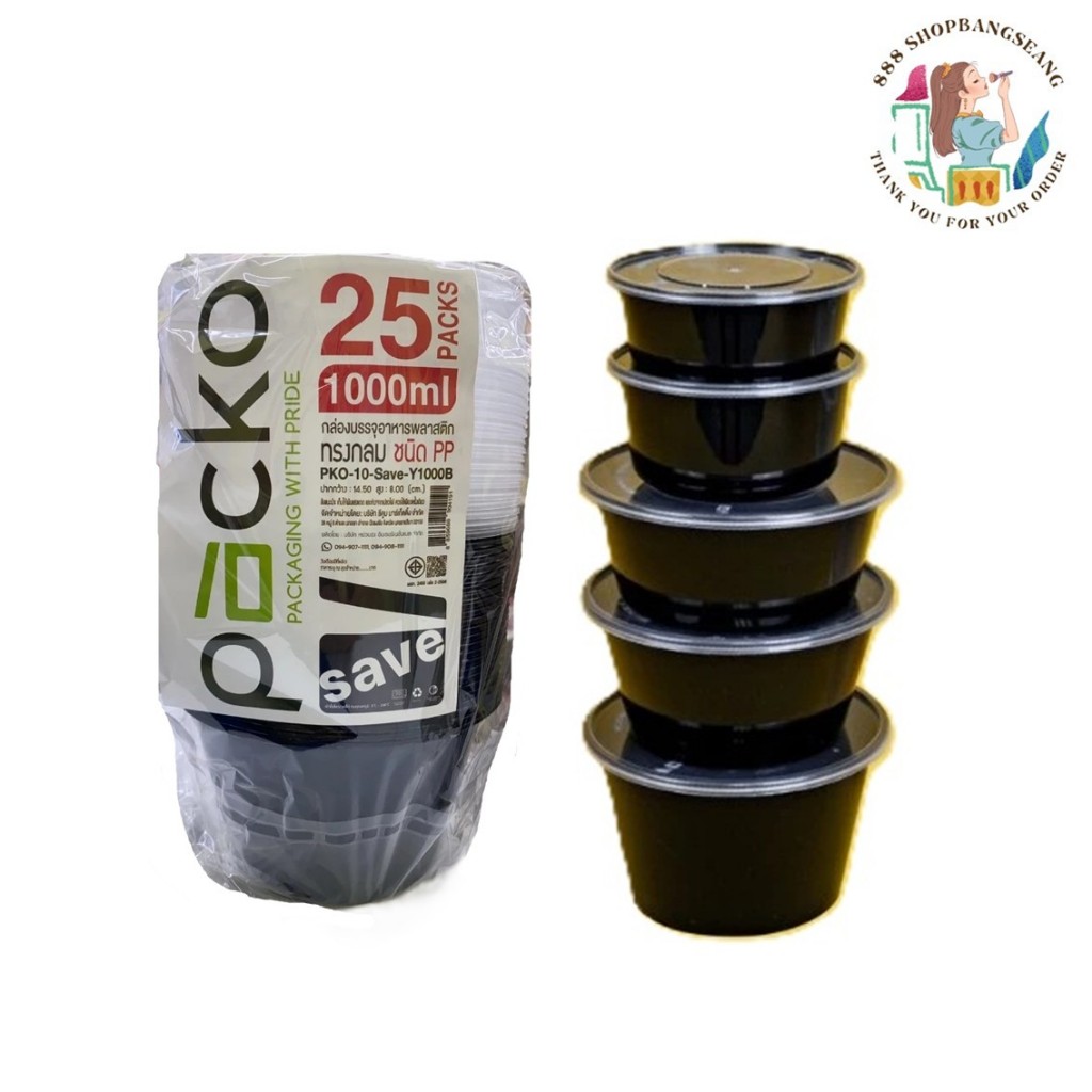 ถ้วยพร้อมฝา กล่องพลาสติกบรรจุอาหารทรงกลม สีดำ packo 500ml,750ml (25ชิ้น/แพ็ค)
