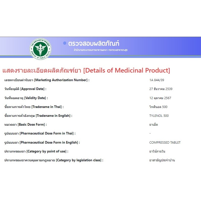 [ยาสามัญประจำบ้าน] Tylenol ยาเม็ดพาราเซตามอล ไทลินอล 500 มก. แผง 10 เม็ด (ยกกล่อง 20แผง)