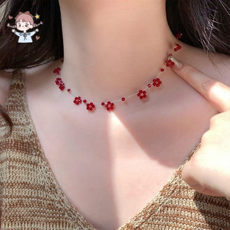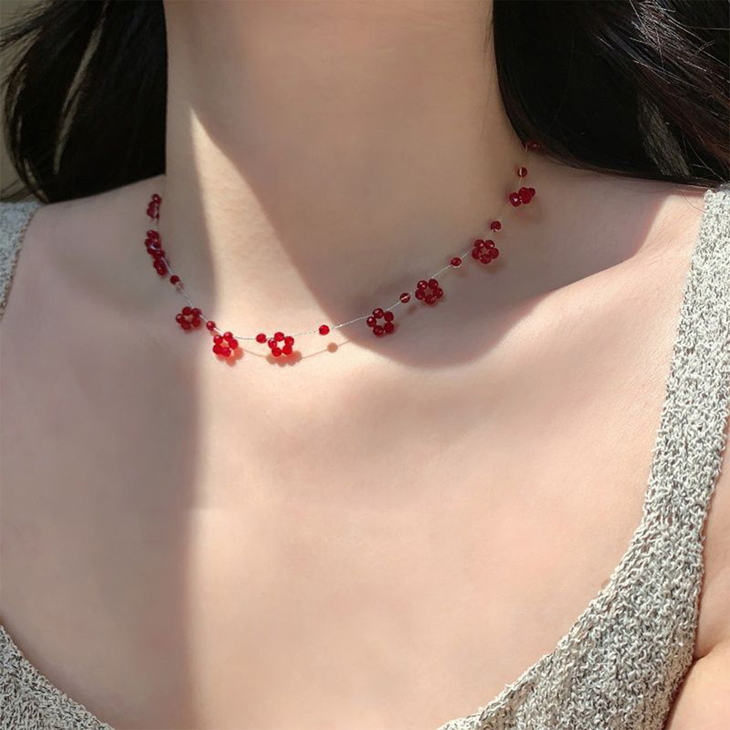 สร้อยคอมีลูกปัดทรงหลากสีแดงสดใสพร้อมโซ่แบบกระดูก สวยงามสำหรับฤดูร้อน