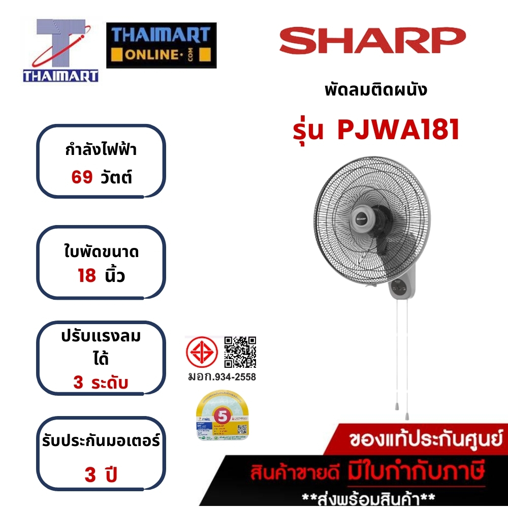 SHARP พัดลมติดผนัง 18 นิ้ว SHARP PJ-WA181-สีเทา | ไทยมาร์ท THAIMART
