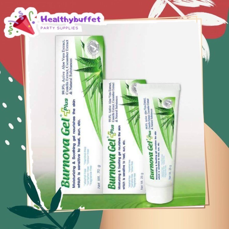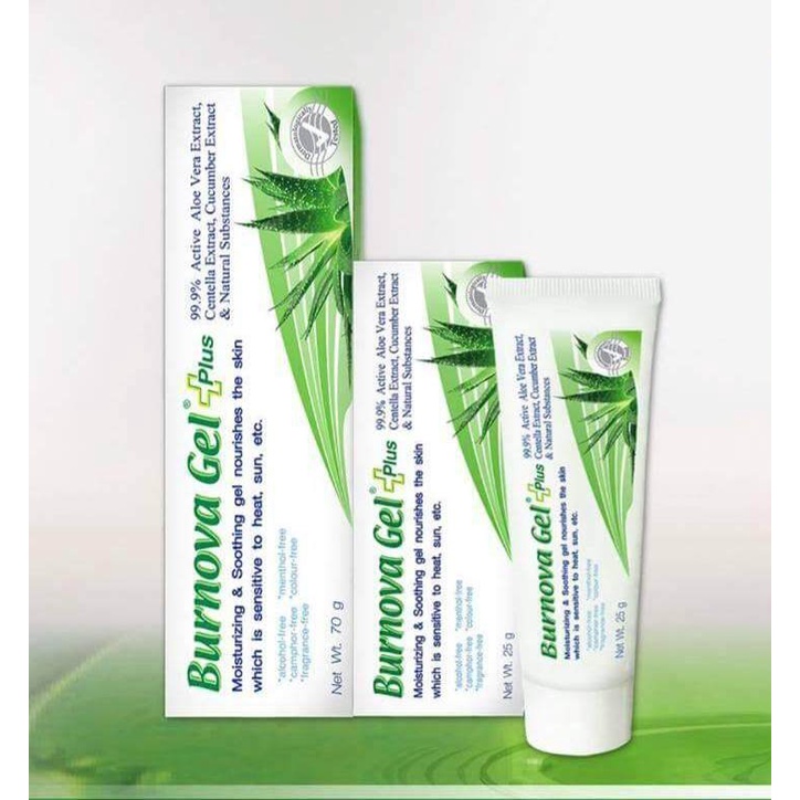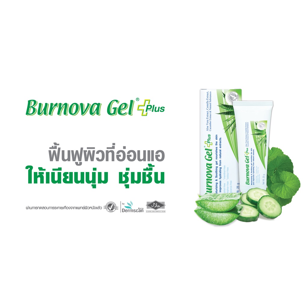 สีเขียว เบอร์นโนว่า เจล พลัส Burnova Gel Plus สูตรว่านหางจระเข้ผสมสารสกัดบัวบกและแตงกวา 25 กรัม / 70 กรัม