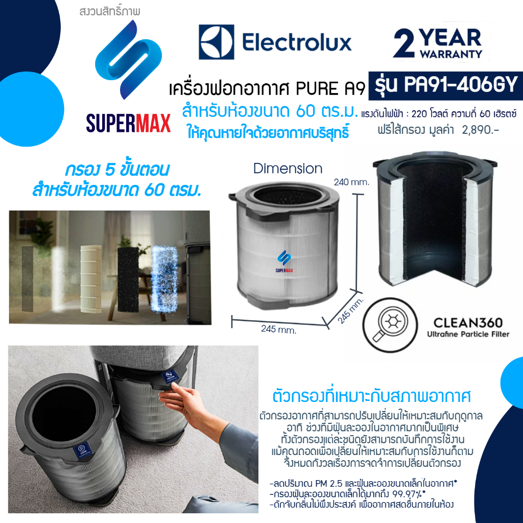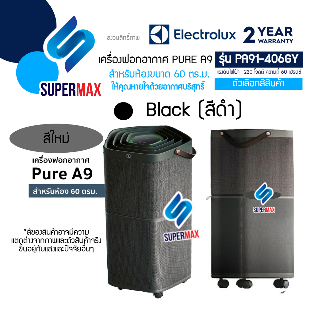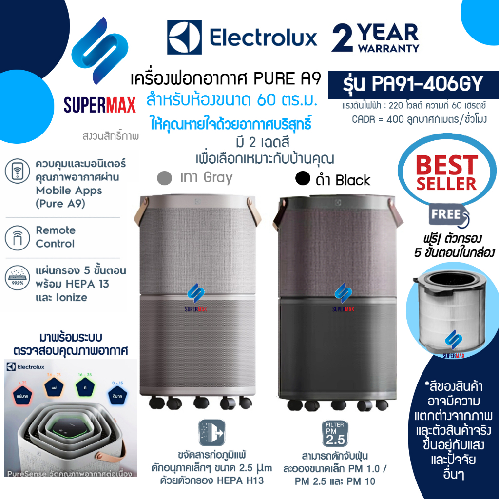 ELECTROLUX เครื่องฟอกอากาศ รุ่น PA91-406DG Pure A9 พร้อมตัวกรอง 5 ขั้นตอน สำหรับห้องขนาดถึง 60 ตรม. มี2สีดำ รับประกันสิน