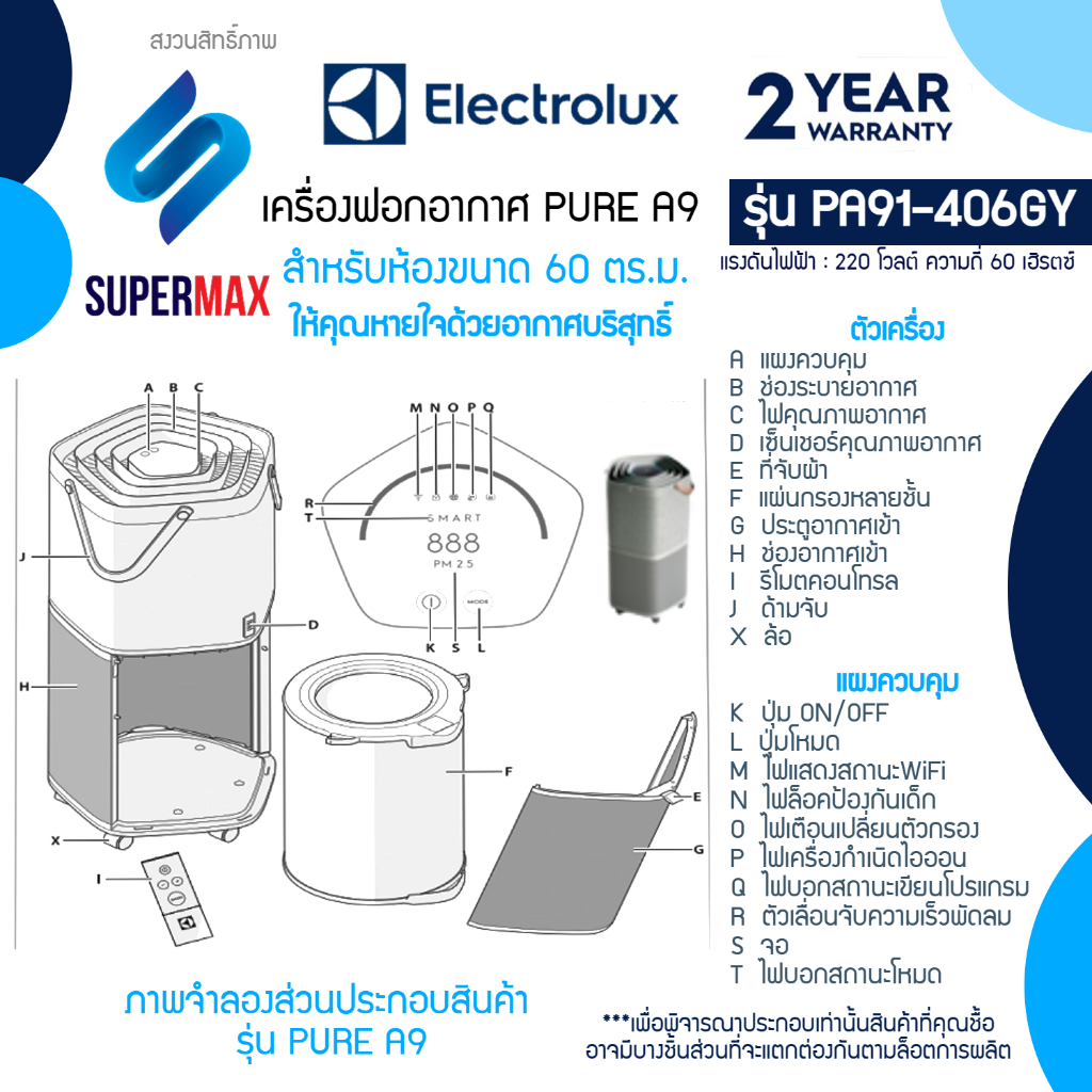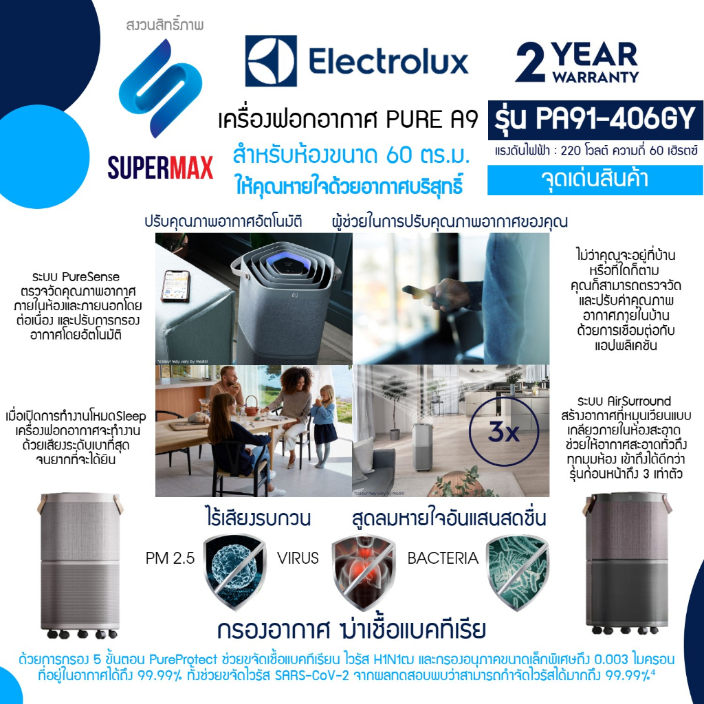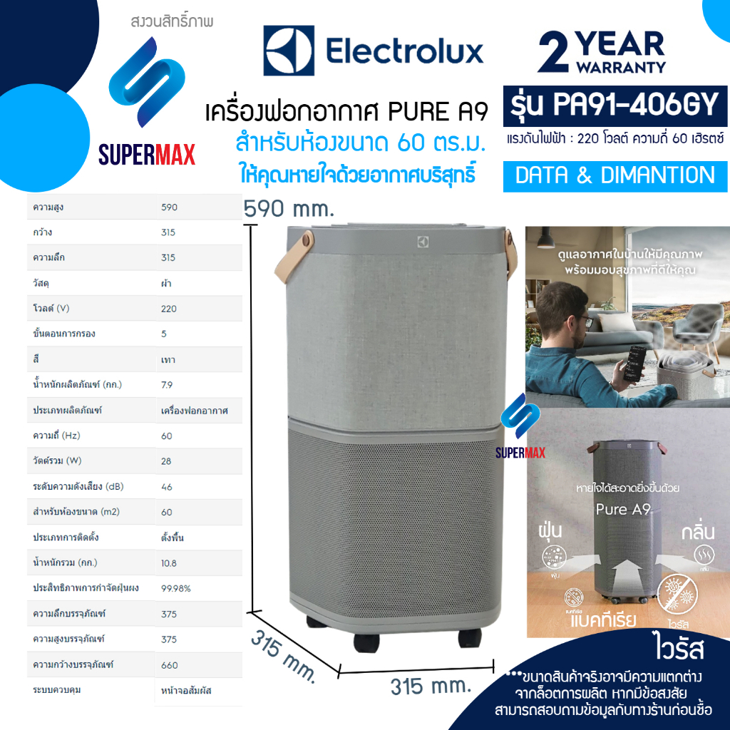 ELECTROLUX เครื่องฟอกอากาศ รุ่น PA91-406DG Pure A9 พร้อมตัวกรอง 5 ขั้นตอน สำหรับห้องขนาดถึง 60 ตรม. มี2สีดำ รับประกันสิน
