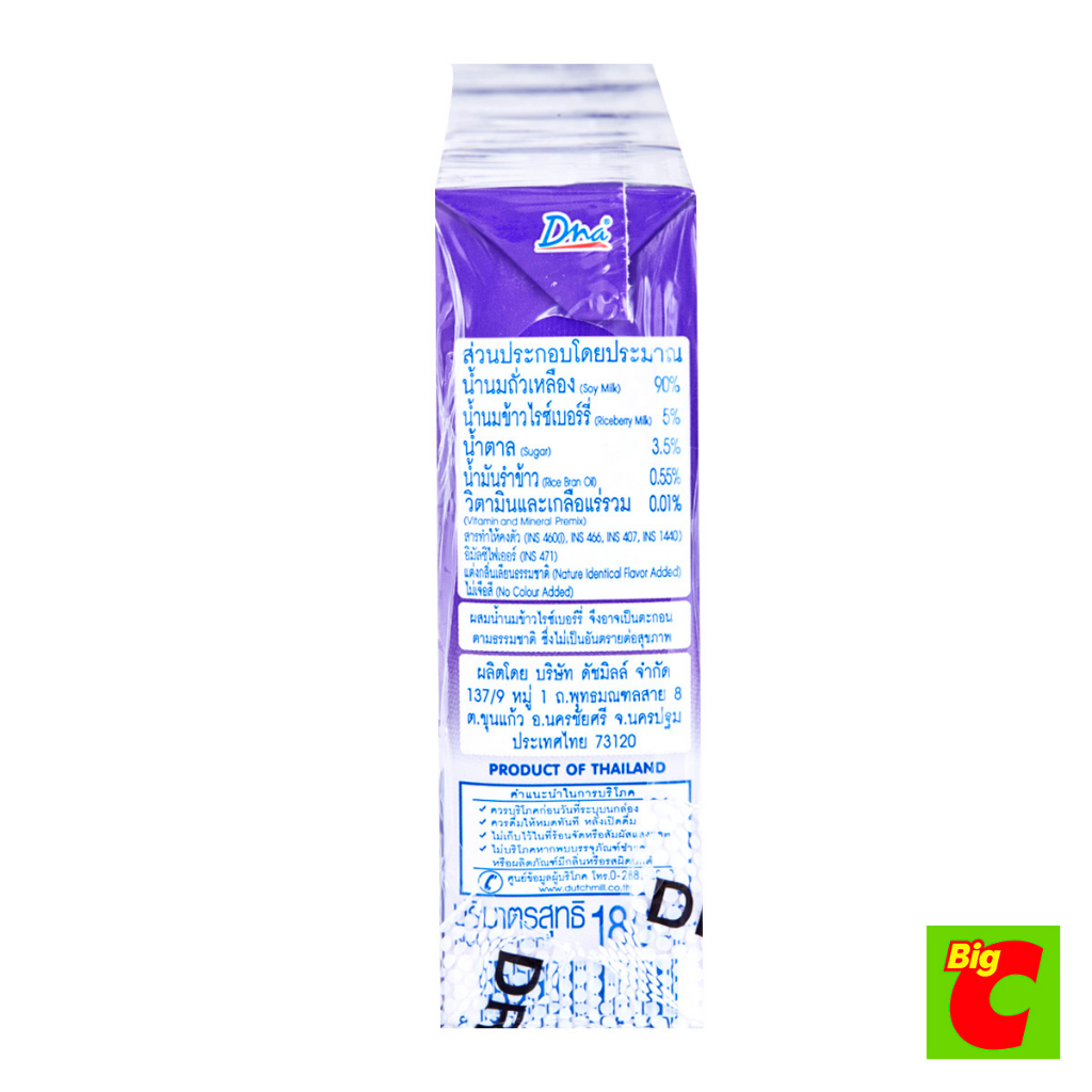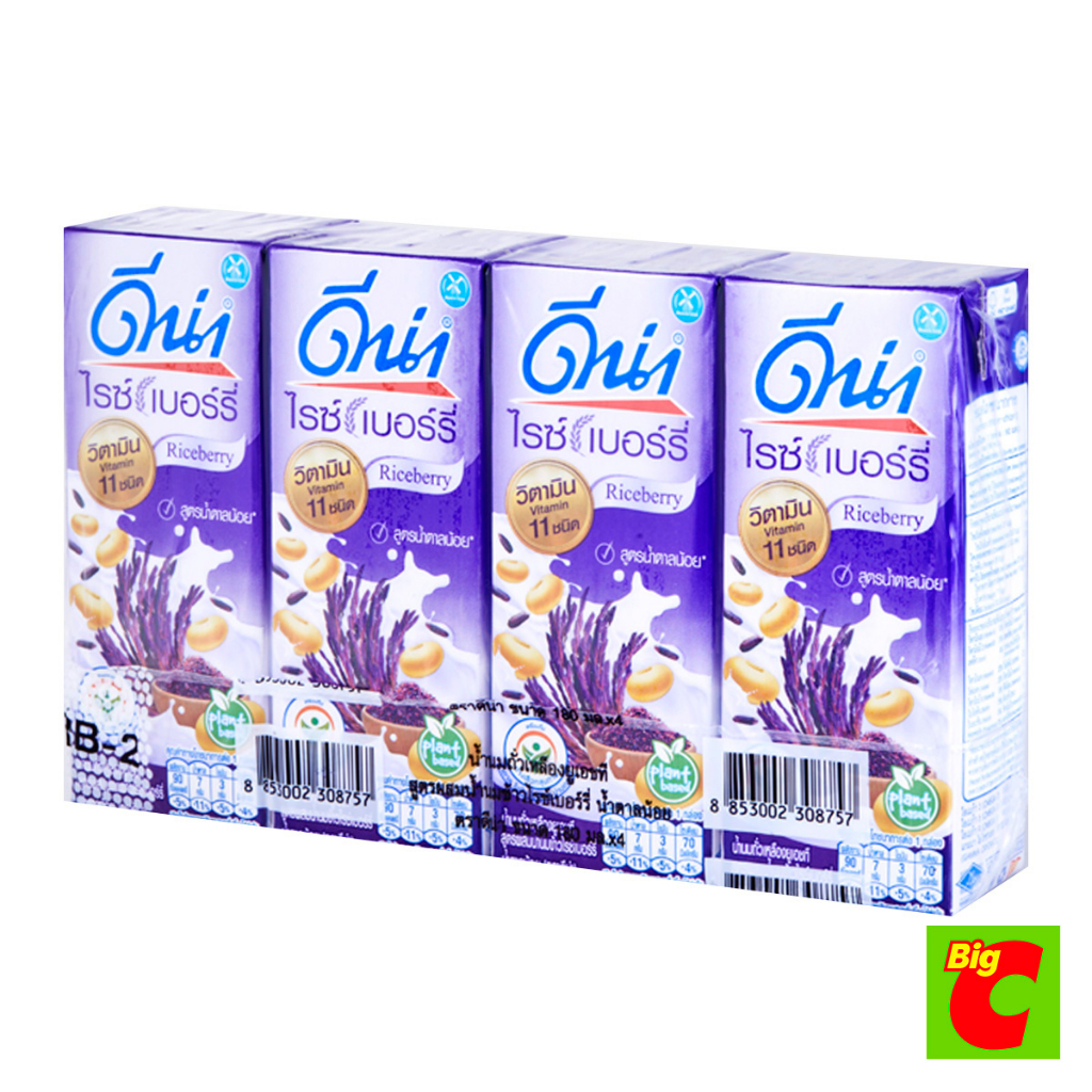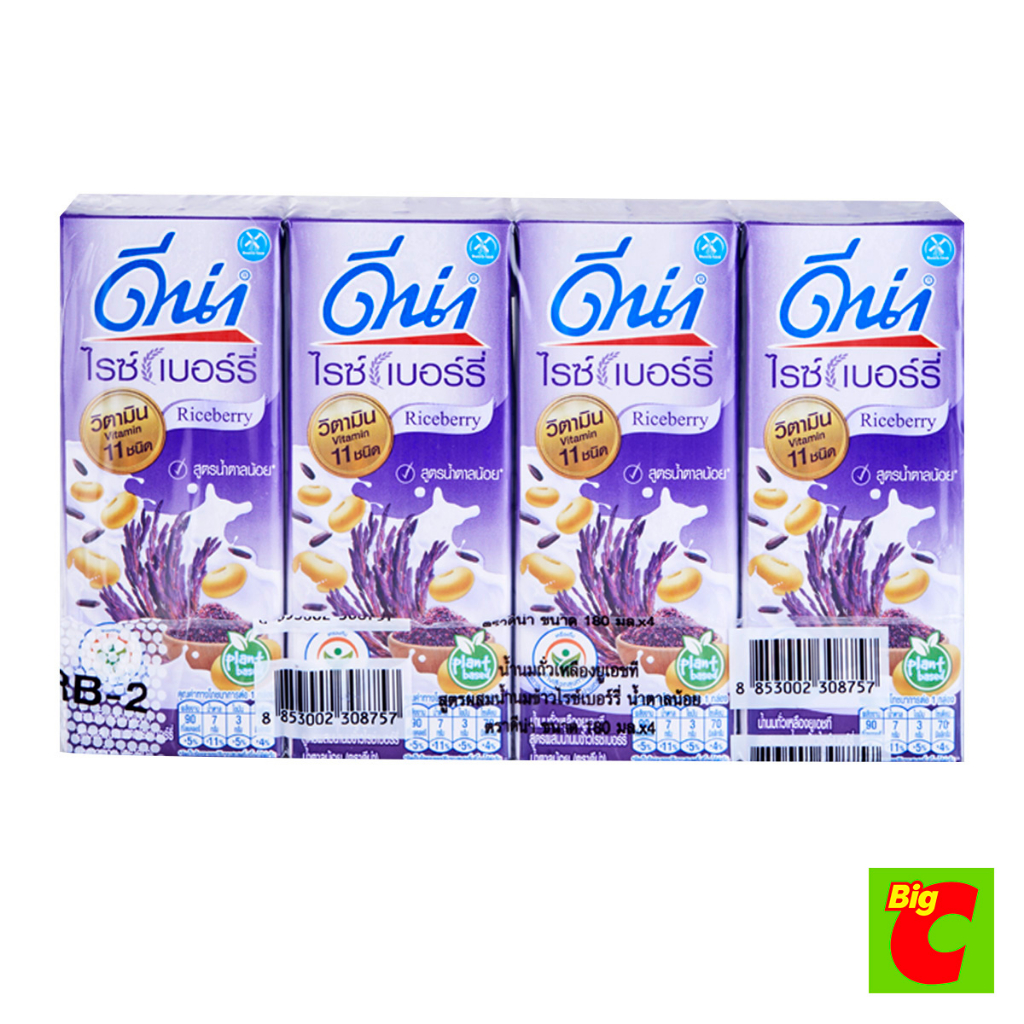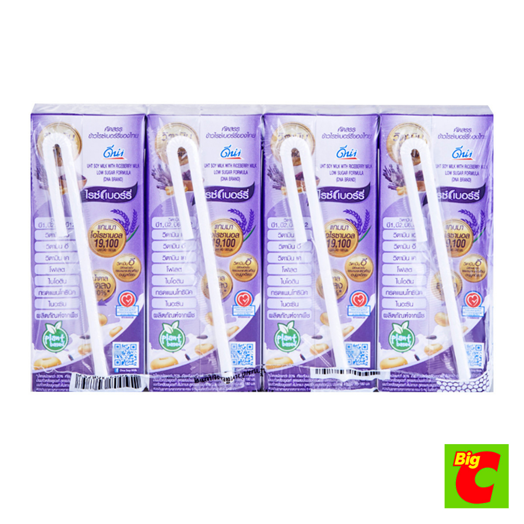 Dna ดีน่า นมถั่วเหลืองยูเอชที สูตรผสมน้ำนมข้าวไรซ์เบอร์รี่ น้ำตาลน้อย 180 มล. แพ็ค 4