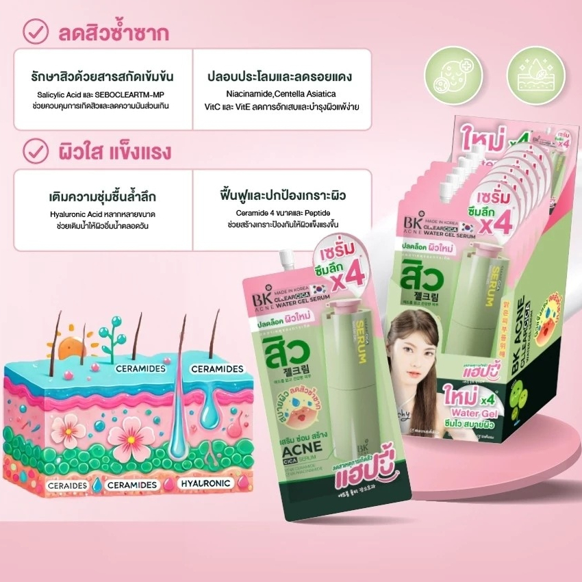 (กล่อง 6 ซอง) BK Acne Cllear Cica water gel Serum บีเค เอคเน่ เซรั่มซึมลึก x4 (8 g.)