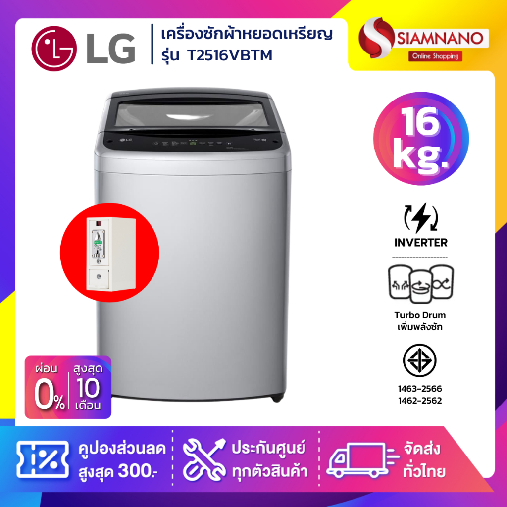 รุ่นใหม่! เครื่องซักผ้าหยอดเหรียญ LG Inverter รุ่น T2516VBTM ขนาด 16 KG สีเทา (รับประกันกล่องหยอดเหรียญ 6 เดือน)