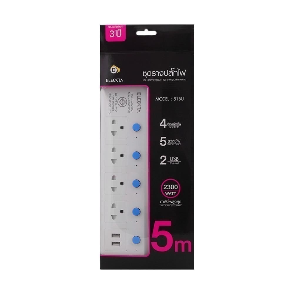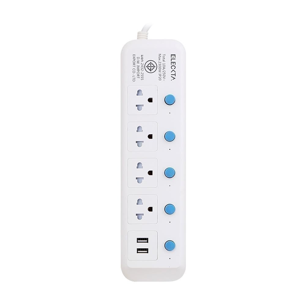ELECKTA รางปลั๊กไฟ 4 ช่อง 5 สวิตช์ 2 USB 815UELEK 5 ม. จัดส่งโดย HomePro