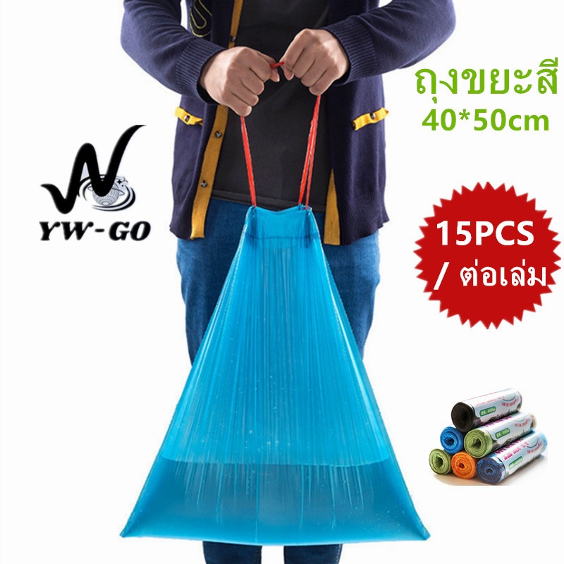 15 ชิ้น/ม้วน (40x45 ซม.) ถุงขยะใบใหญ่ ถุงขยะอย่างหนา ถุงขยะพลาสติกสี การออกแบบเชือกดึง G2041