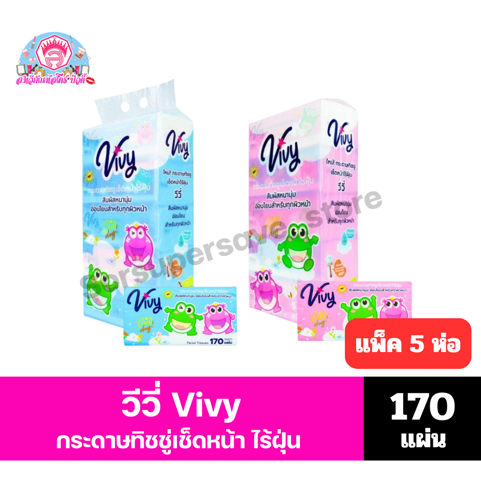 วีวี่ Vivy กระดาษทิชชูเช็ดหน้าไร้ฝุ่น ขนาด 170 แผ่น*//*แพ็ค 5 ห่อ*//* คละสี