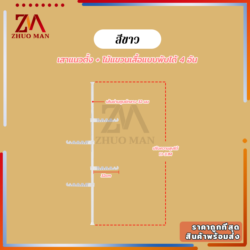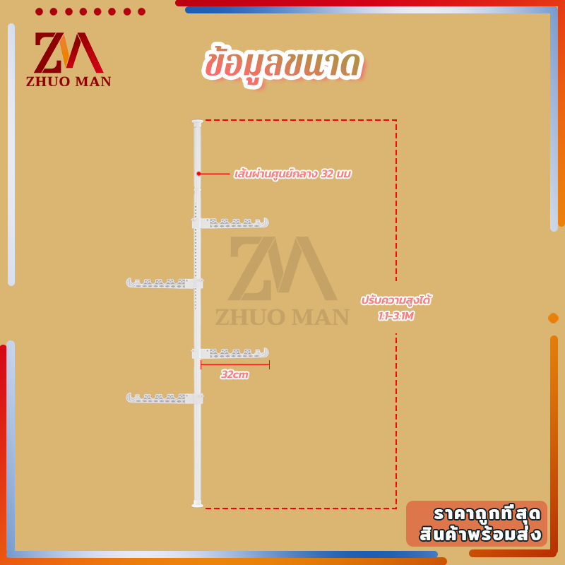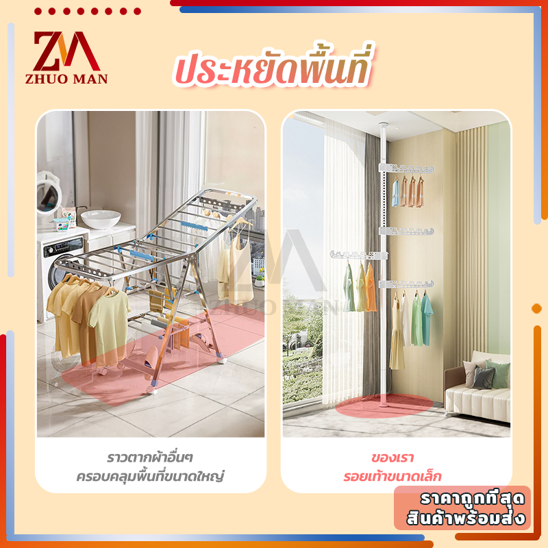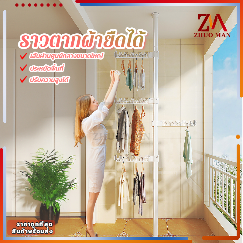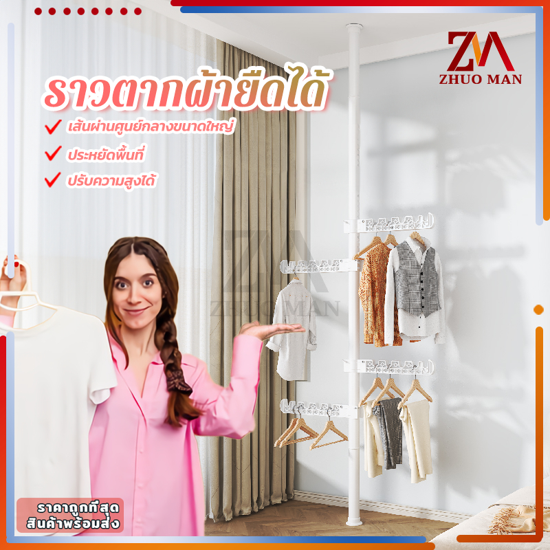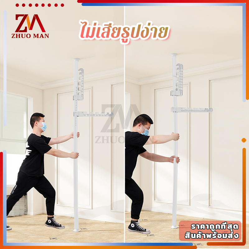 ราวตากผ้ายืดได้ ราวแขวนผ้า คุณภาพสูง ไม่ต้องเจาะเพดาน ยืดหดได้ สูงสุด 3.1 เมตร แถมตัวแขวน 4 อัน ปรับได้หลายระดับ