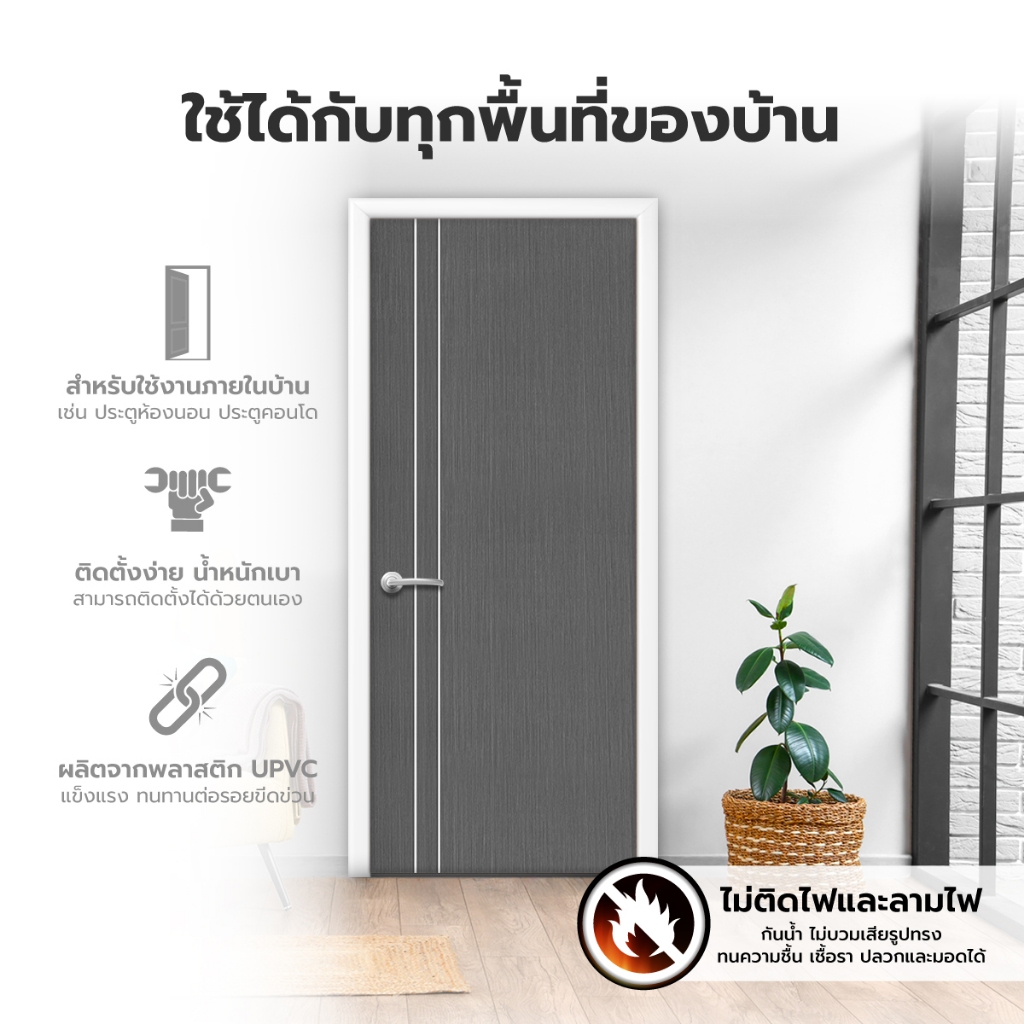 ECODOOR ประตู UPVC ภายใน 80x200 ซม. รุ่น PE1 สีเทา (เจาะลูกบิด) |BAN|
