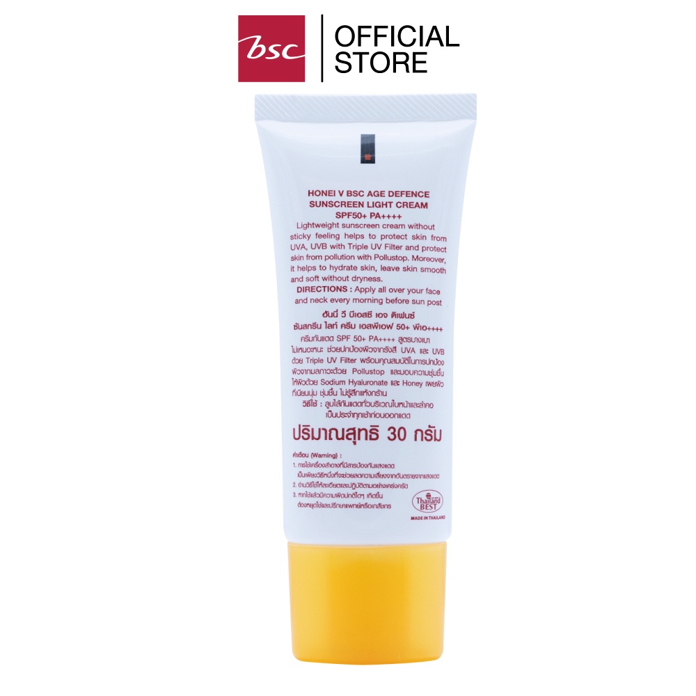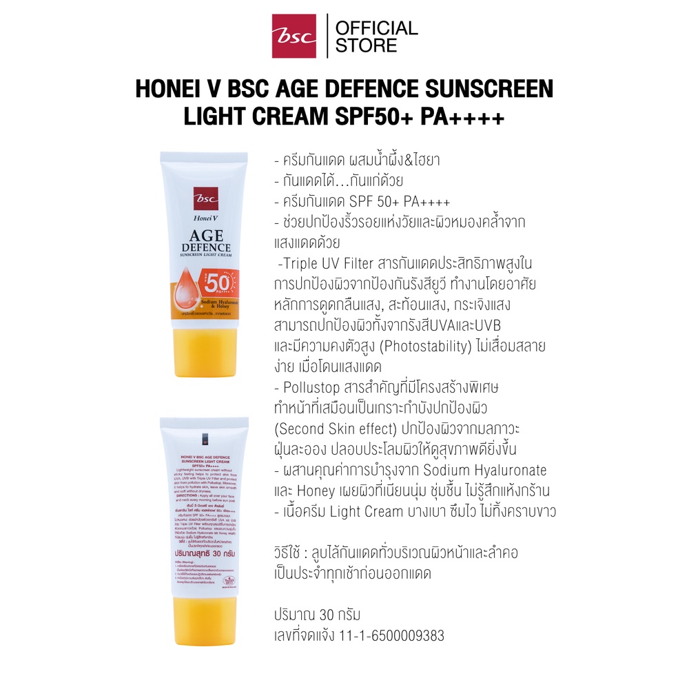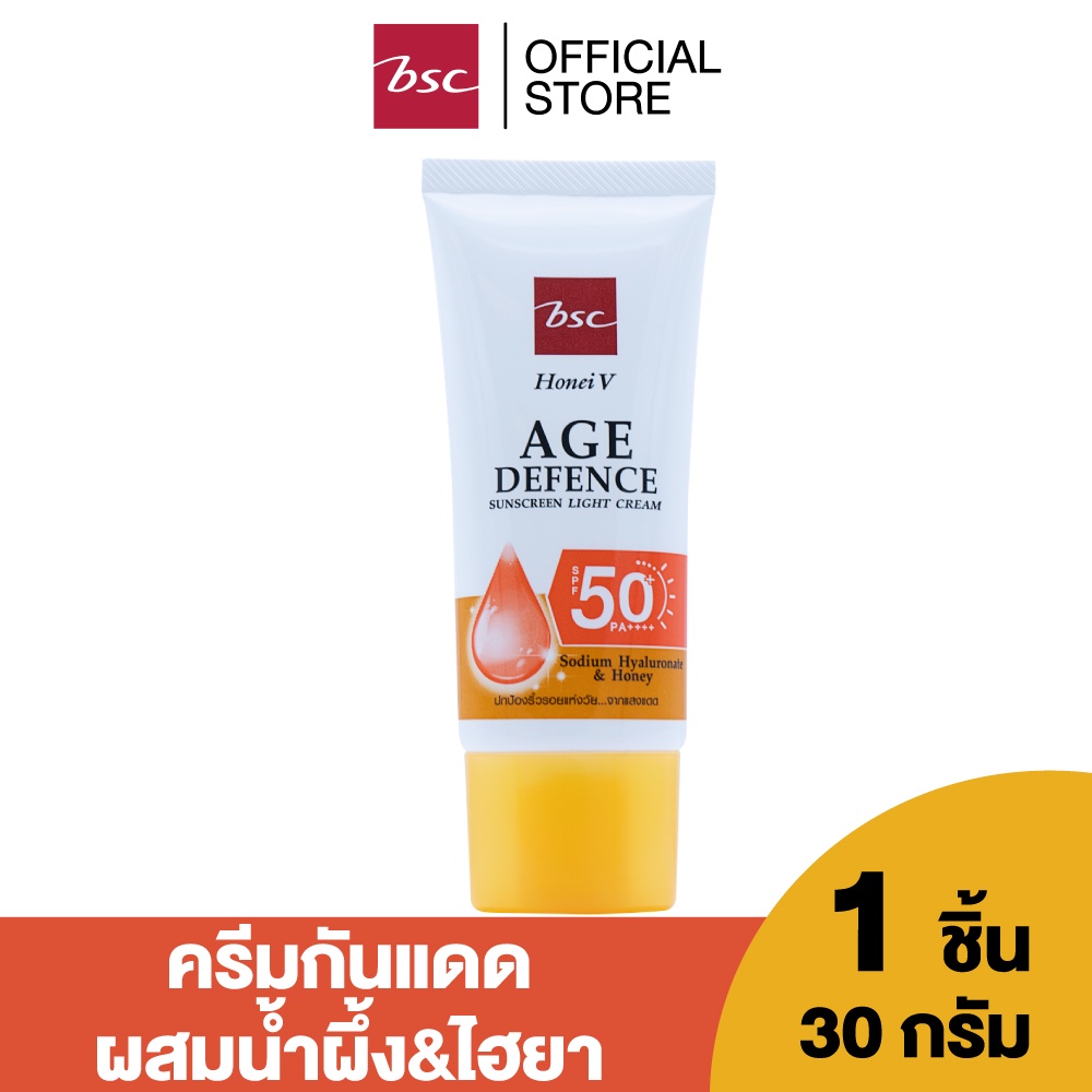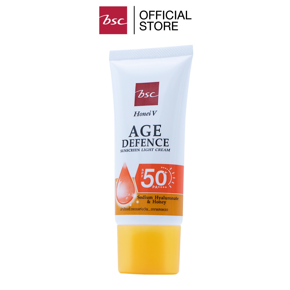 HONEI V BSC AGE DEFENCE SUNSCREEN LIGHT CREAM SPF50+ PA++++ 30 กรัม ครีมกันแดด ผสมน้ำผึ้ง&ไฮยา กันแดดได้...กันแก่ด้วย