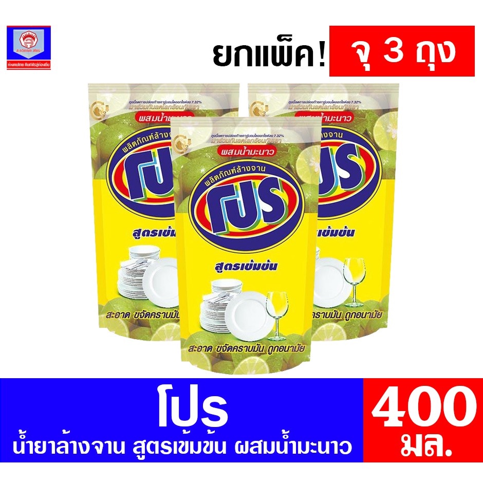 โปร (Pro) ผลิตภัณฑ์น้ำยาล้างจาน สูตรผสมมะนาว ขนาด 400 มล. ( แพ็ค 3 ถุง )