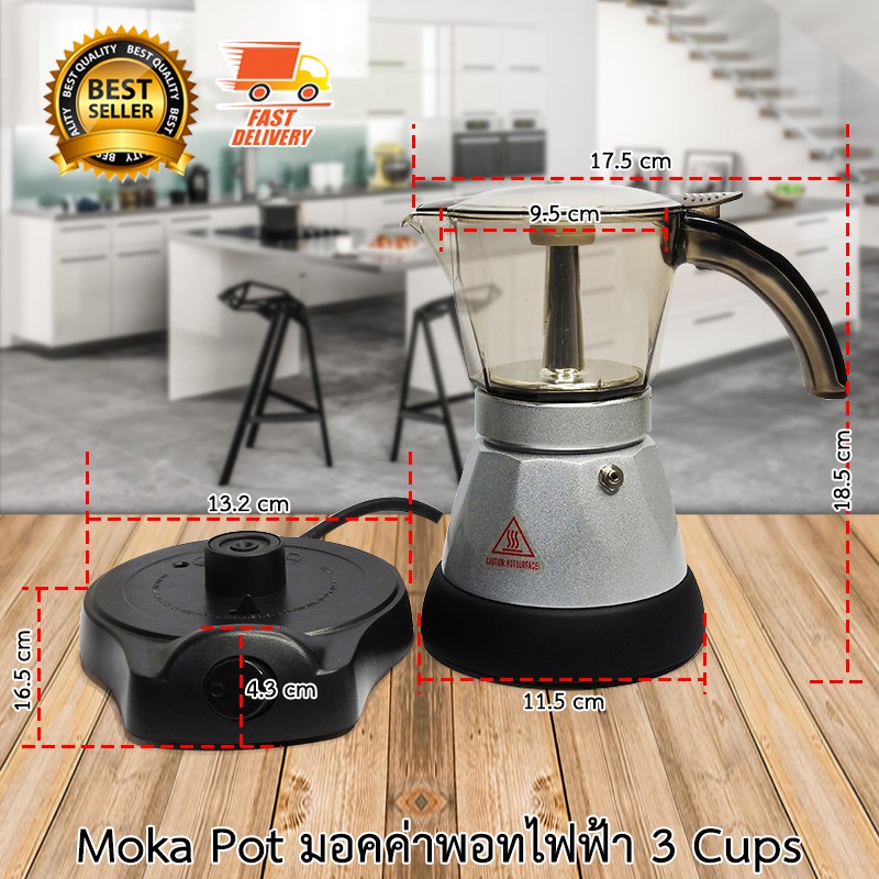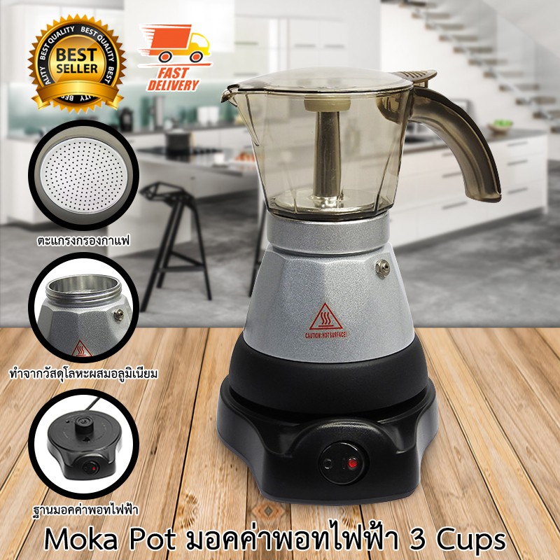 Electric Moka Pot หม้อต้มกาแฟสด ไฟฟ้า มอคค่าพอท ไฟฟ้า สำหรับ 3 cup สีเทา