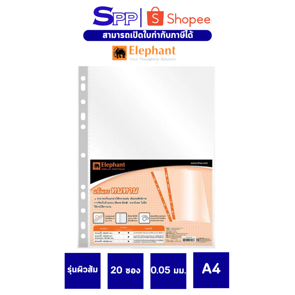 ไส้แฟ้ม ซองใสเอนกประสงค์ ตราช้าง รุ่นผิวส้ม 0.05 มม. A4 จำนวน 20 ซอง/แพ็ค