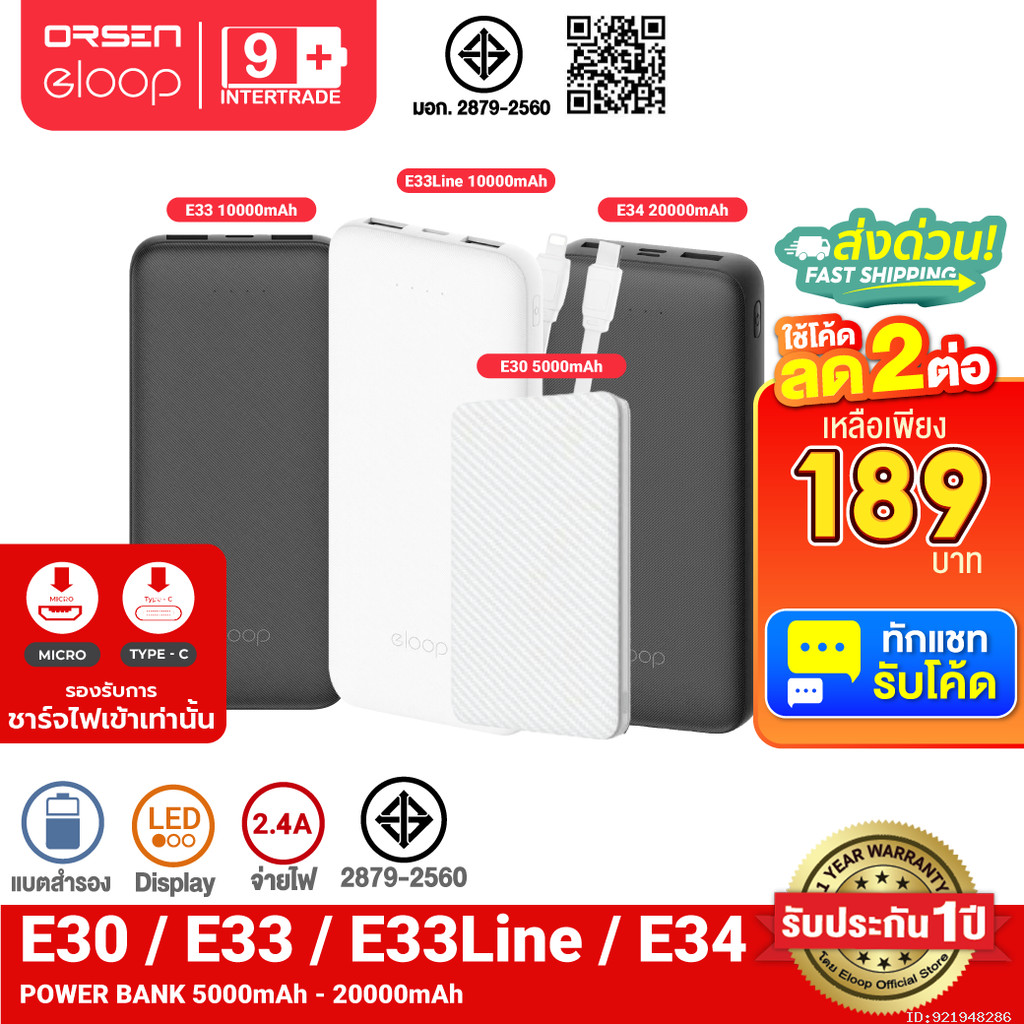 [189บ.โค้ดคุ้ม] Eloop E30 / E33 / E33 Line / E34 แบตสำรอง 5000mAh 10000mAh 20000mAh Powerbank พาวเวอร์แบงค์
