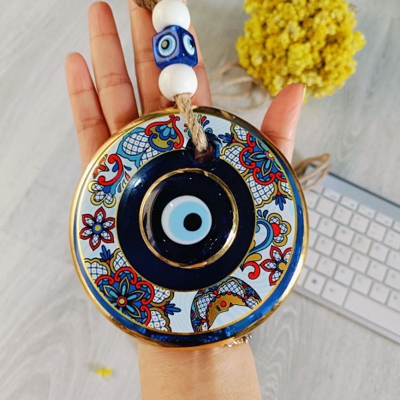 Evil Eye ของแท้ จากตุรกี แก้วสีฟ้าสองชั้นขอบทอง เพ้นท์มือ ปกป้องจากสิ่งไม่ดีเสริมพลังบวก สามารถซื้อเป็นของฝากของขวัญได้