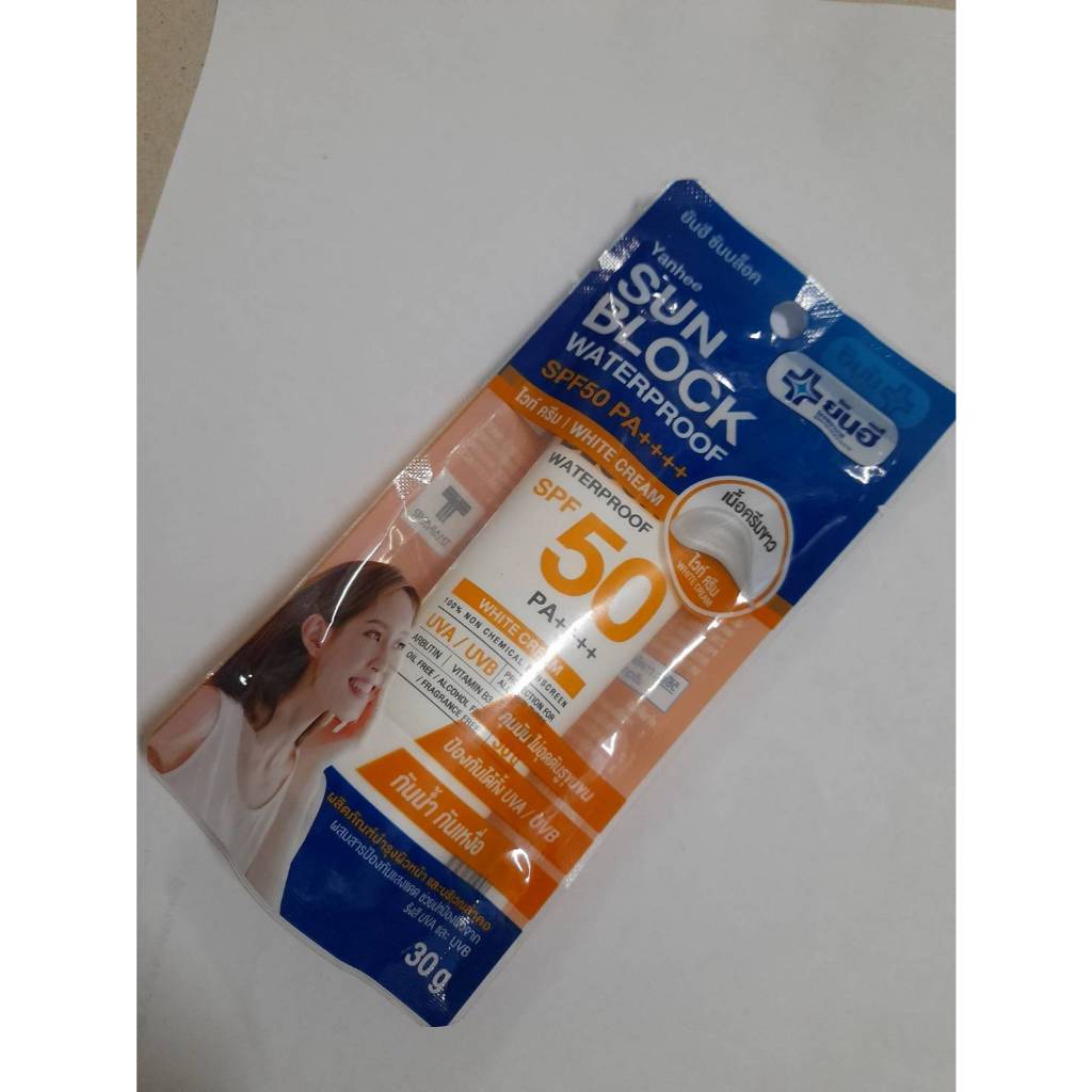 ยันฮี ซันบล็อค วอเตอร์พรูฟ สีไวท์ ครีม SPF50 PA++++ ผลิตภัณฑ์บำรุงผิวหน้าและบริเวณลำคอจาก รพ.ยันฮี