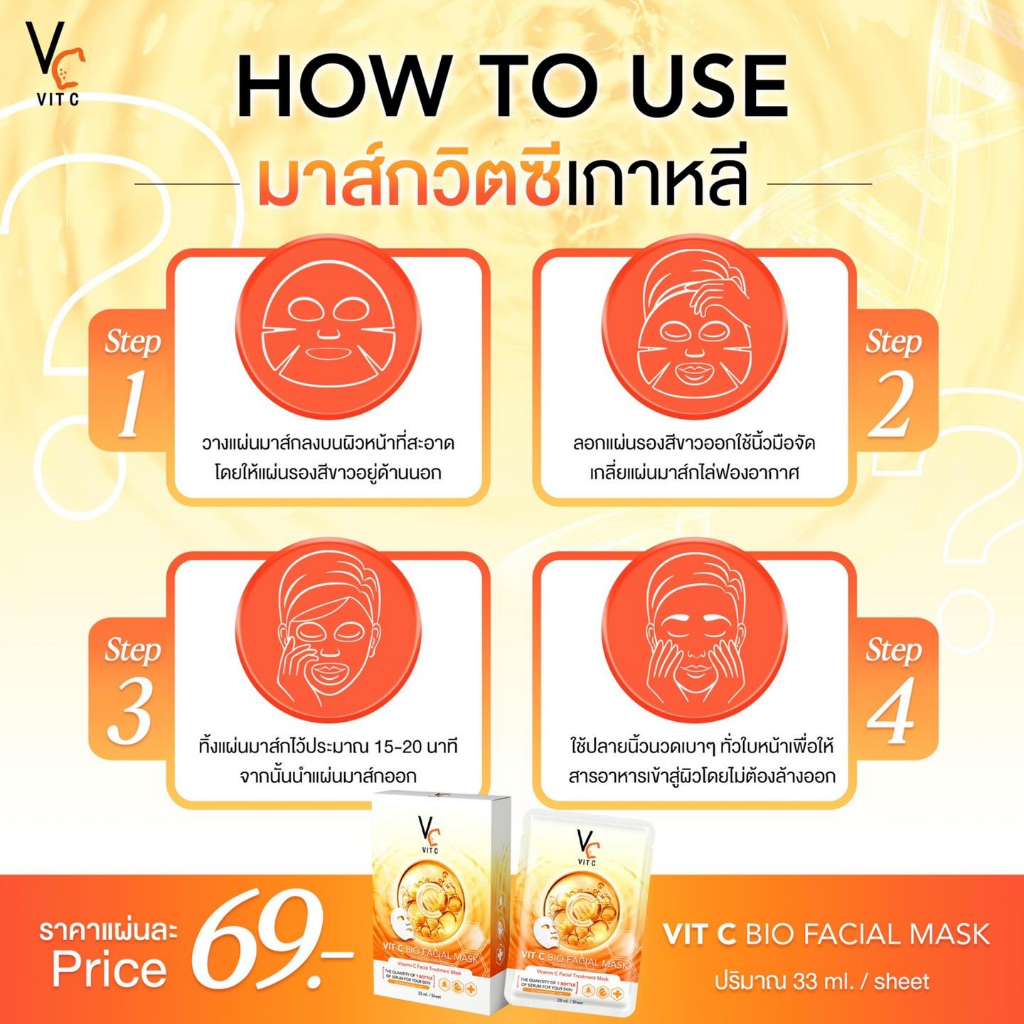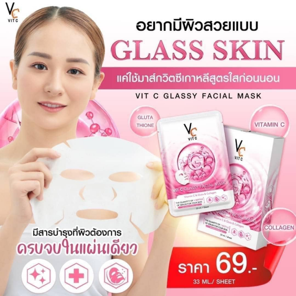 (1แผ่น) Vc VIT C BIO / GLASSY FACIAL MASK รัชชา วิตซี ไบโอ / กลาสซี่ เฟเชียล มาส์ก 33 ml.
