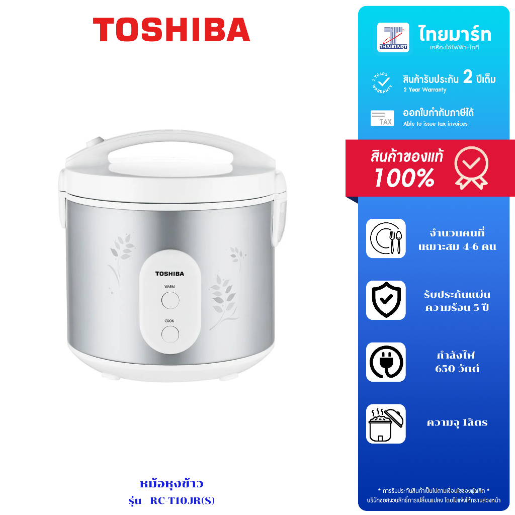 TOSHIBA หม้อหุงข้าวอุ่นทิพย์ รุ่น RC-T10JR(S) กำลังไฟ 650W