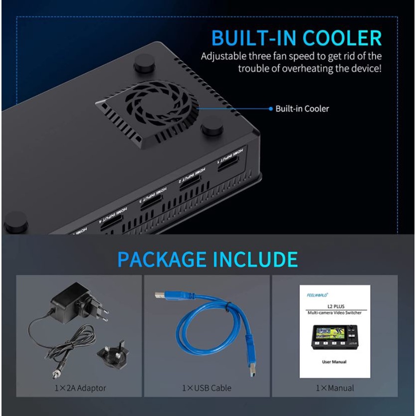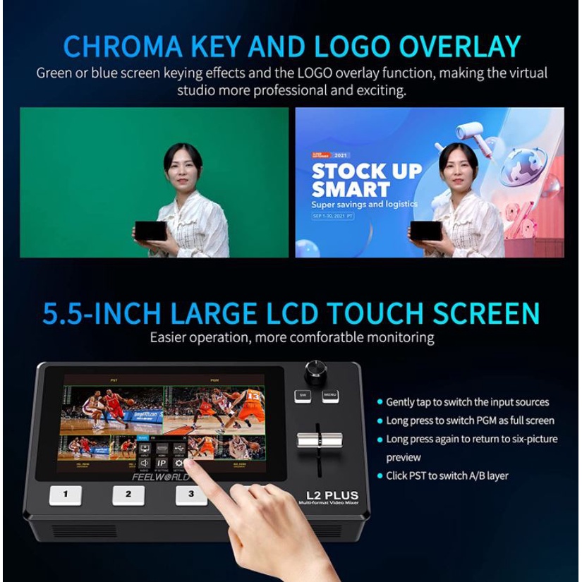 FEELWORLD L2 PLUS Multi-camera Video Mixer Switcher with 5.5" LCD Touch Screen PTZ Control Chroma Key USB3.0