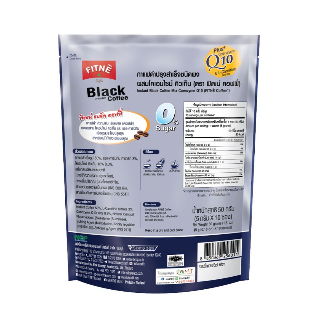 FITNE' ฟิตเน่ แบล็ค คอฟฟี่ กาแฟดำปรุงสำเร็จ 3in1 ชนิดผง สูตรผสมโคเอ็นไซม์ คิวเท็นฯ ขนาด 10 ซอง