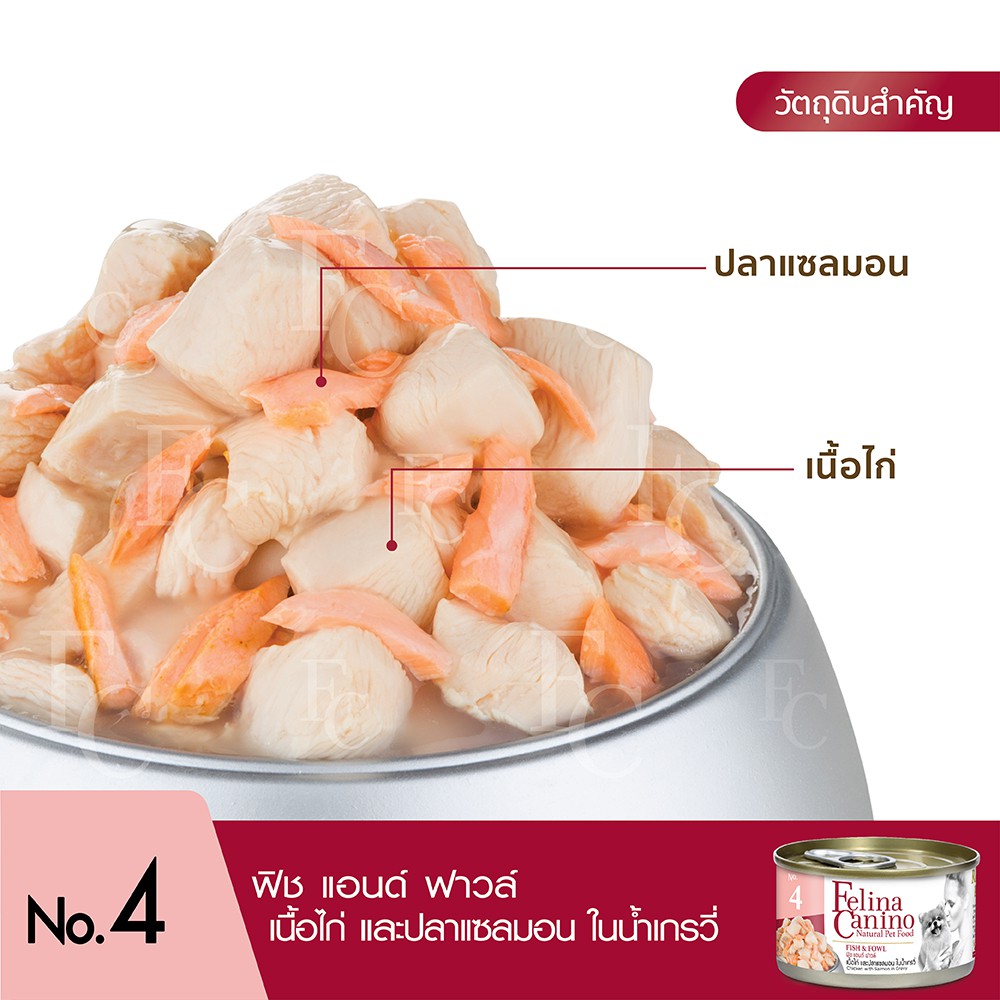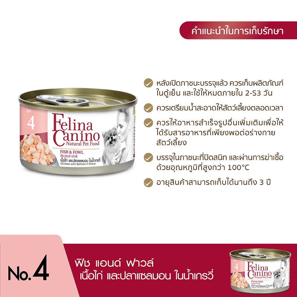 Felina Canino (อาหารสำหรับสุนัข) : NO.4 Fish & Fowl (เนื้อไก่ แซลมอนและน้ำเกรวี่) 85g.