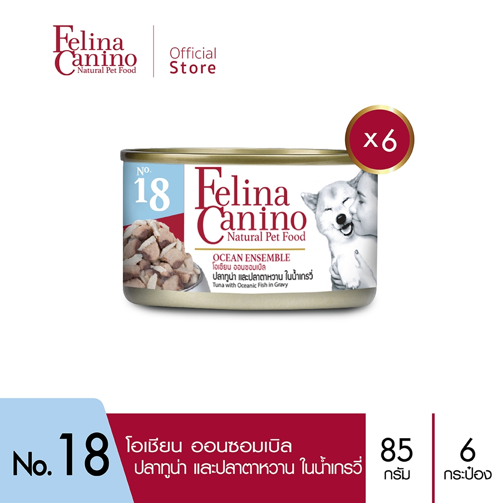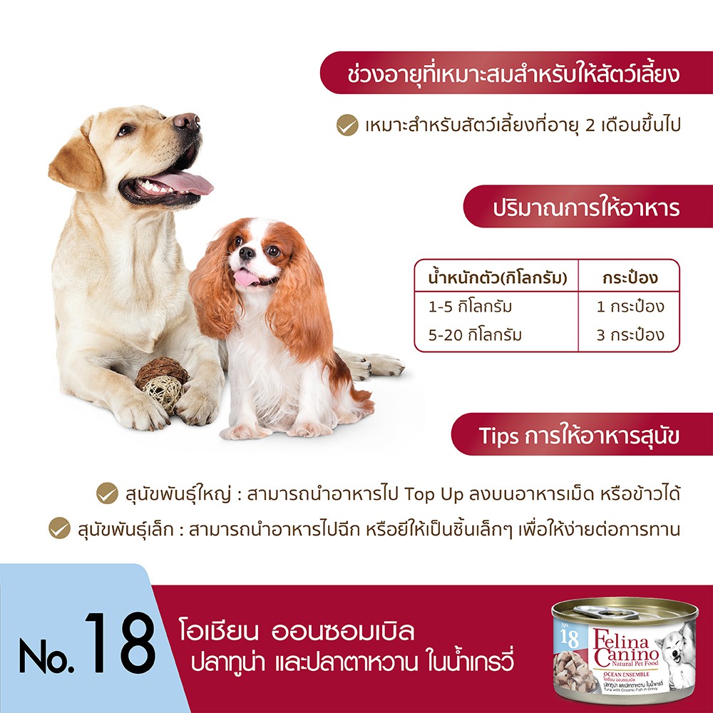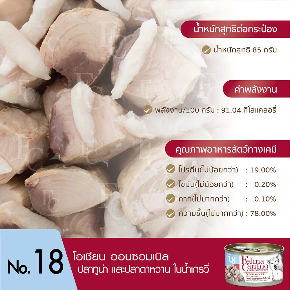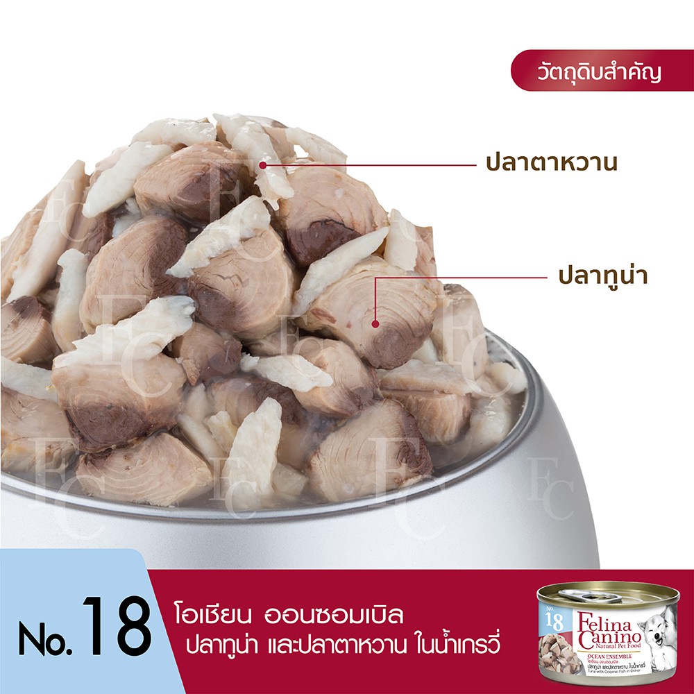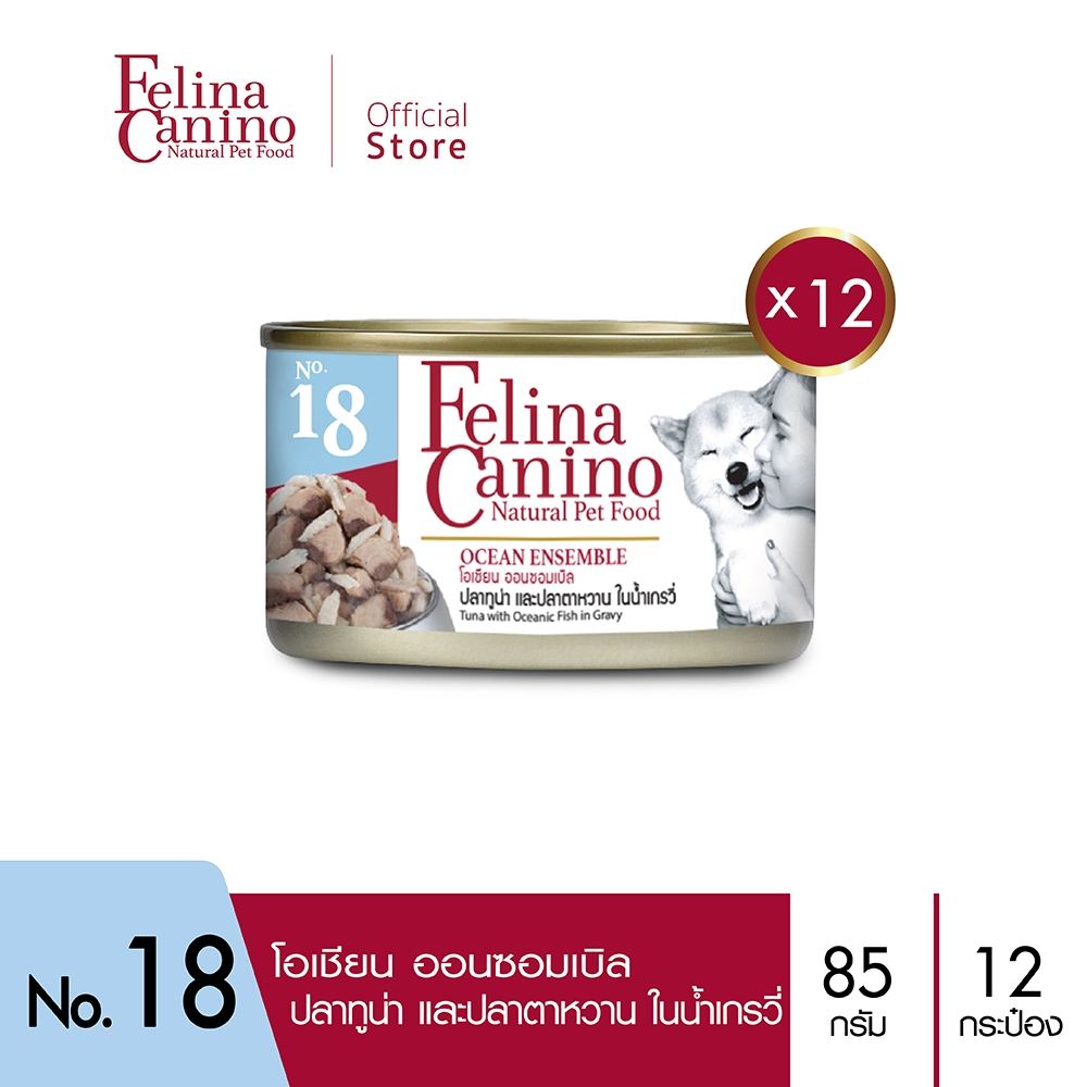 Felina Canino (อาหารสำหรับสุนัข) : NO.18 Ocean Ensemble (ทูน่า ปลาตาหวาน น้ำเกรวี่) 85g.