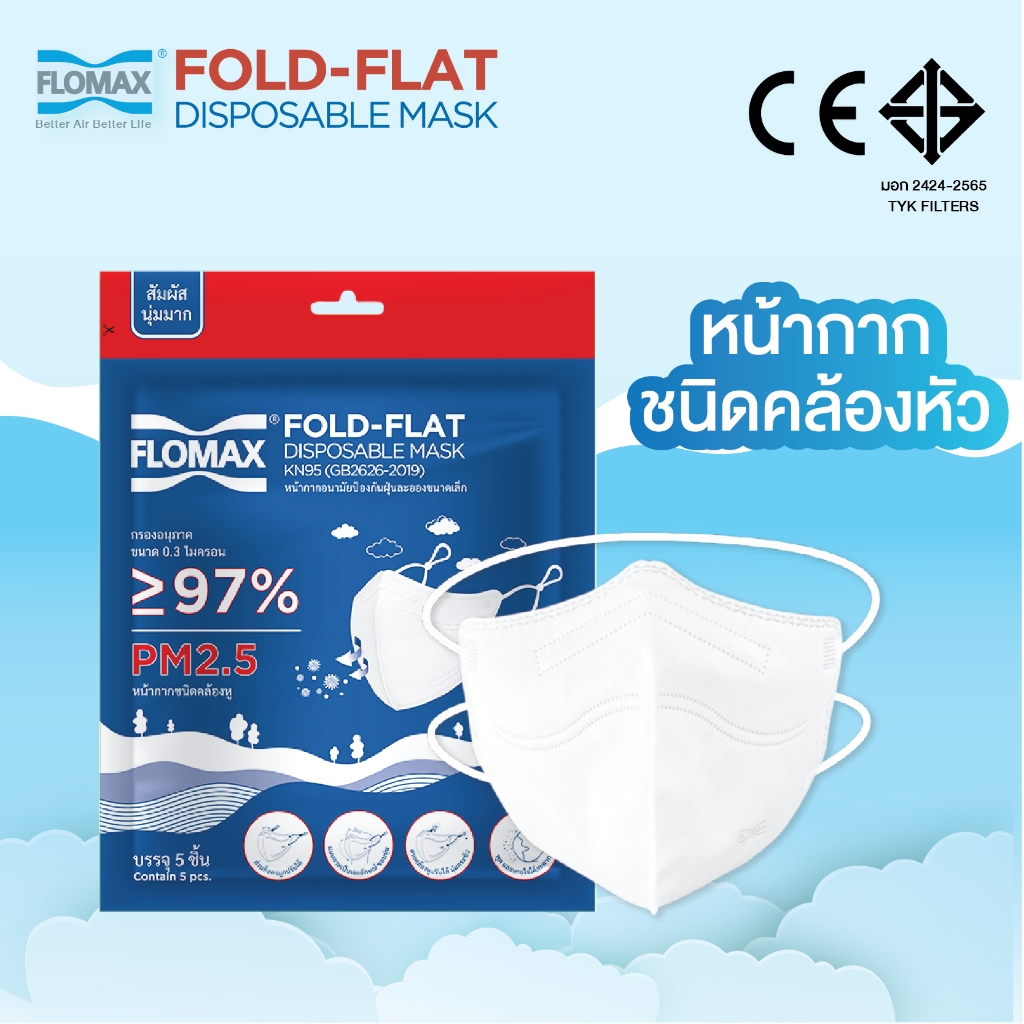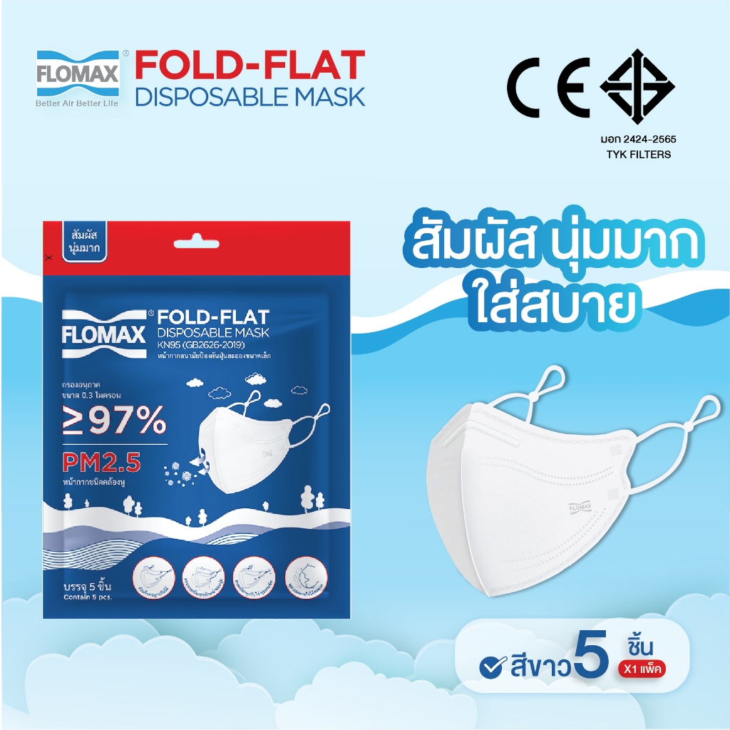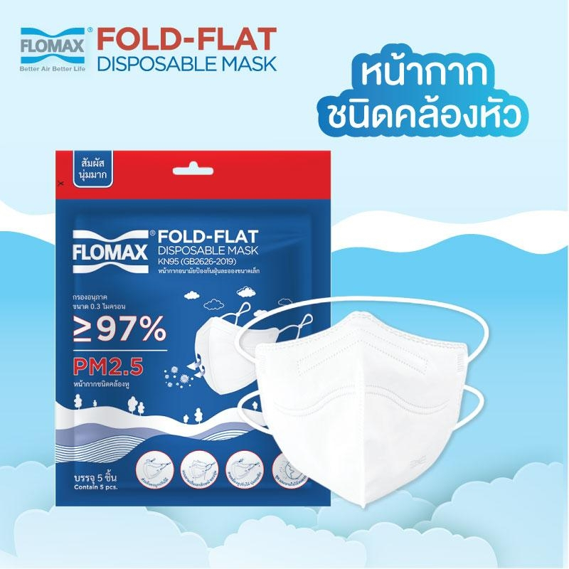 หน้ากากอนามัย Flomax Fold Flat N95, FFP2 ไม่มีวาวล์ (1 แพ็ค = 5ชิ้น) คล้องหู และ คล้องหัว