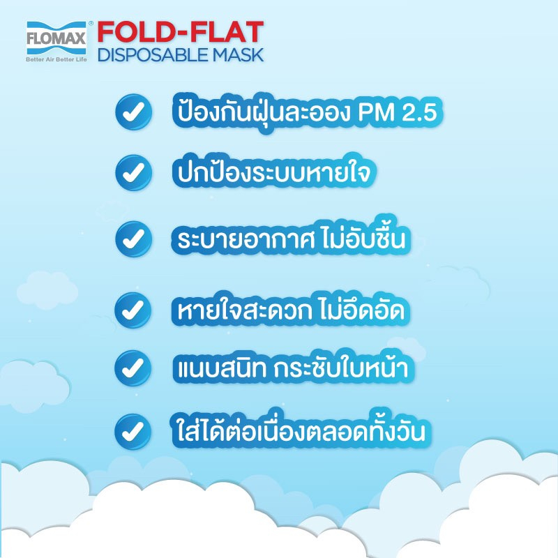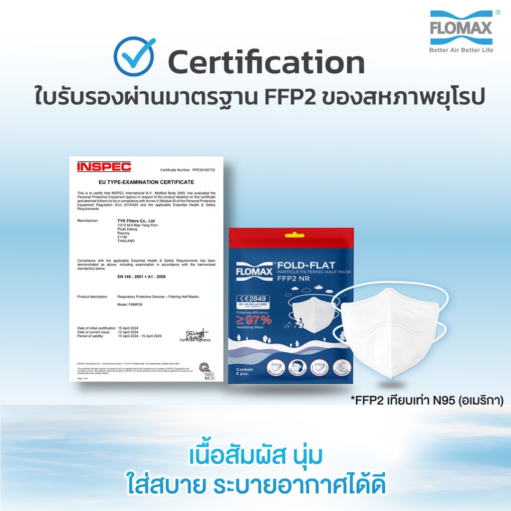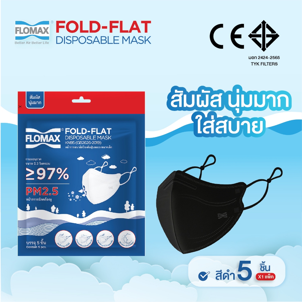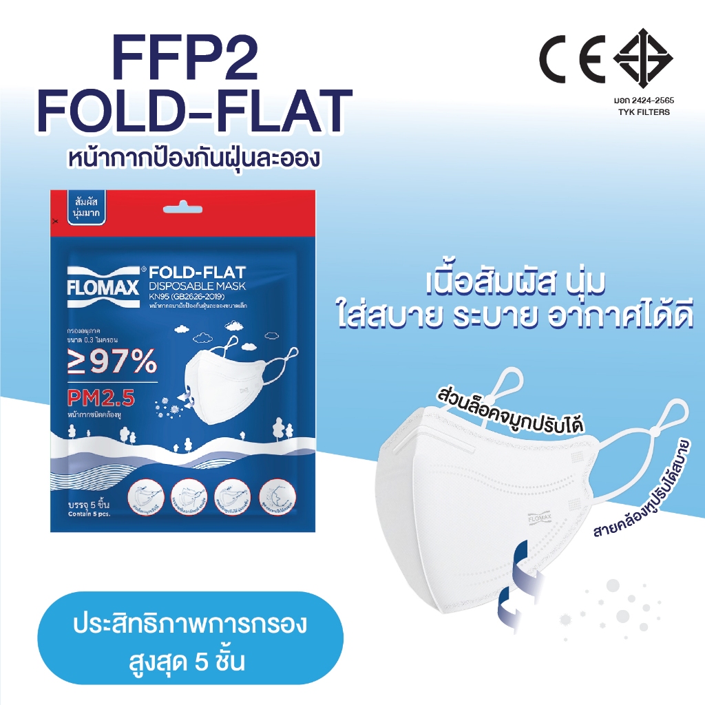 หน้ากากอนามัย Flomax Fold Flat N95, FFP2 ไม่มีวาวล์ (1 แพ็ค = 5ชิ้น) คล้องหู และ คล้องหัว