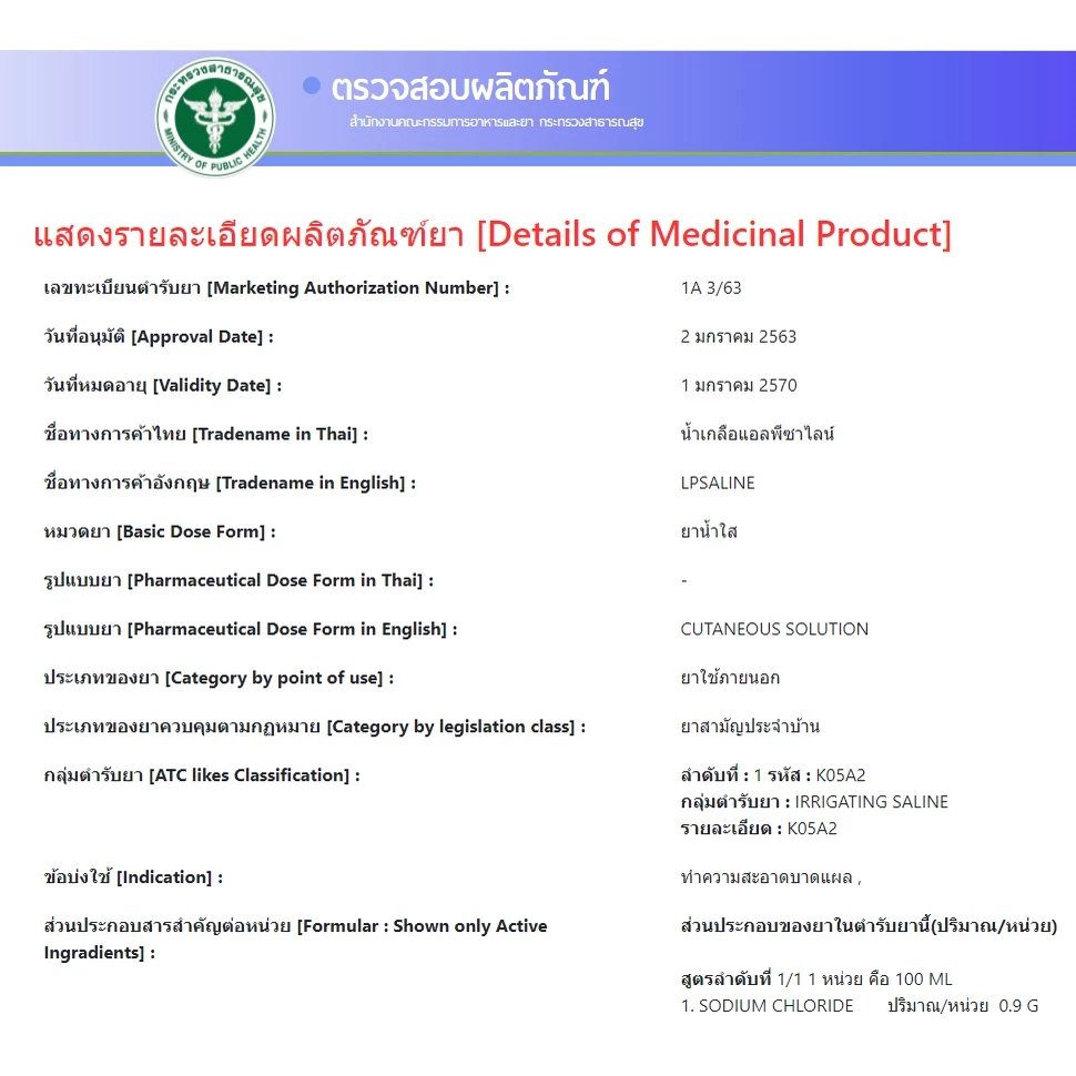 LPSALINE NORMAL SALINE SOLUTION (เเอลพีซาไลน์ นอร์มอลแคร์) น้ำเกลือ ล้างแผล ล้างจมูก ปริมาณ 120/200/500/1000 ml.
