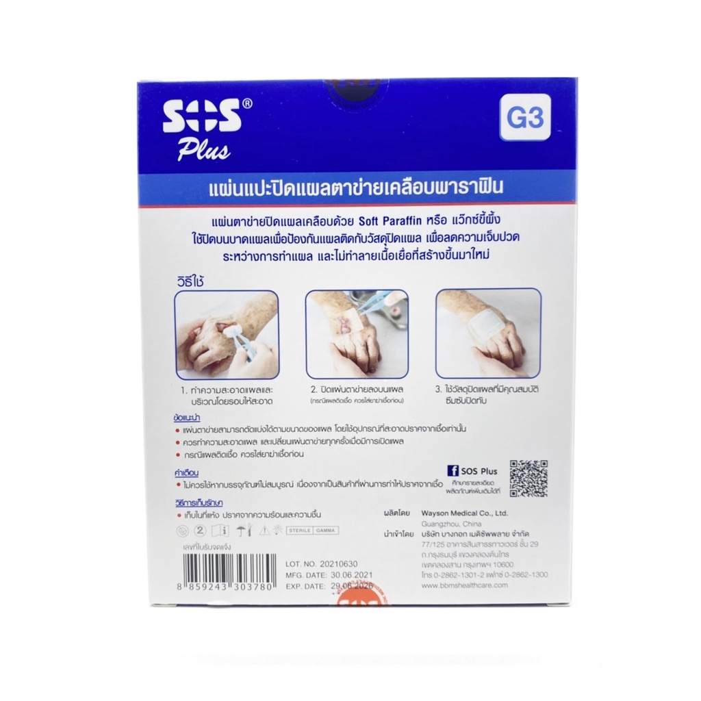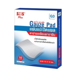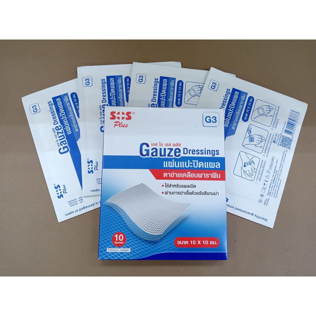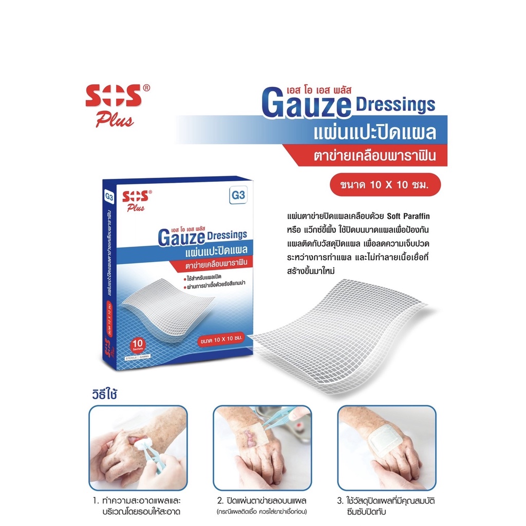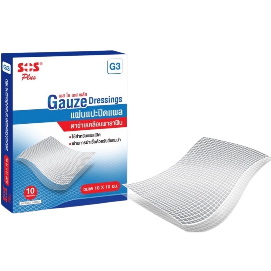 SOS Plus GAUZE Dressing G3 แผ่นตาข่ายปิดแผลเคลือบ Soft Paraffin ขนาด 10x10 cm.10ชิ้น