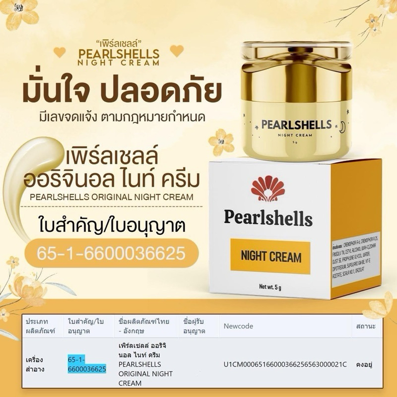 ส่งฟรี/มีไลฟ์ แพ็คเกจใหม่ล่าสุด ครีมเพิร์ลเชลล์ pearl shell night cream 1 กระปุก 5 กรัม