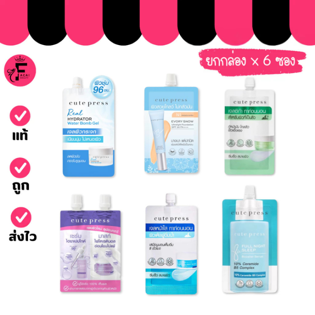 (กล่อง 6 ซอง) Cute press เจลผิวกระจก/รองพื้น/มาส์กสู้สิว/เซรั่ม/เจลหน้าใส (7/8 ml./ 5/10 กรัม)