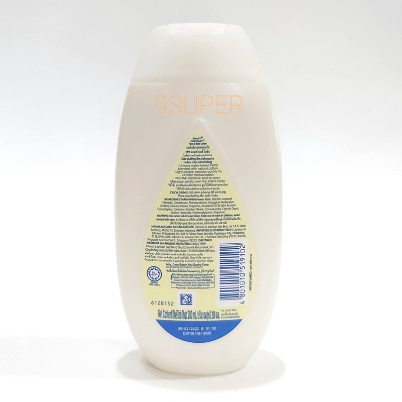 จอห์นสัน เบบี้ โลชั่นเด็ก หน้าและตัว เฟซ แอนด์ บอดี้ โลชั่น คอตตอน ทัช 200 มล. Johnson's Baby
