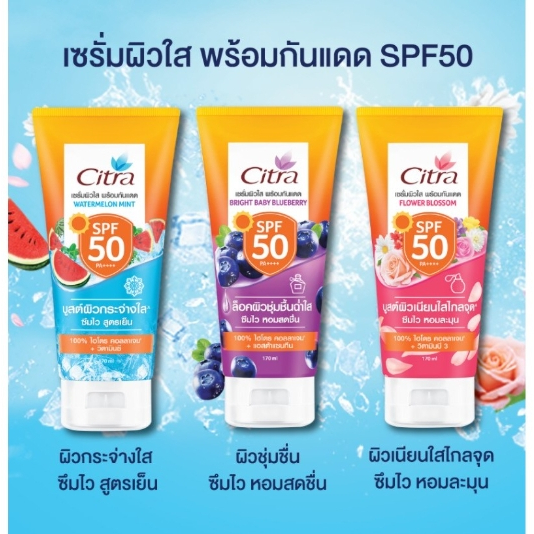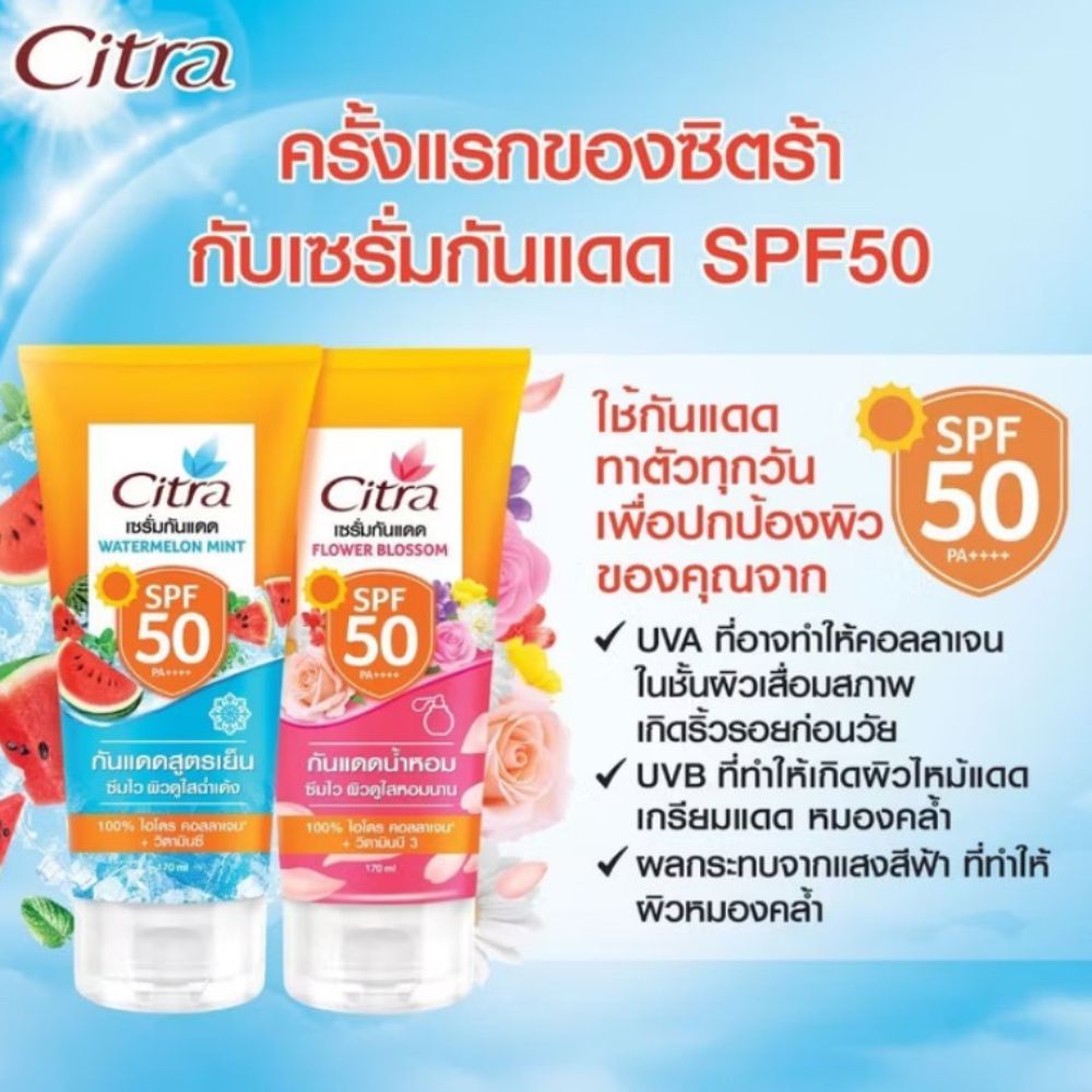 Citra ซิตร้า เซรั่ม กันแดด โทนอัพผิว / วอเตอร์เมลอน มิ้นท์ / ฟลาวเวอร์ บลอสซั่ม เอสพีเอฟ SPF50 PA++++ ซึมไว บางเบา