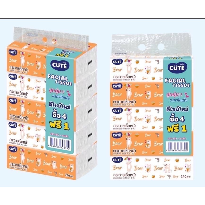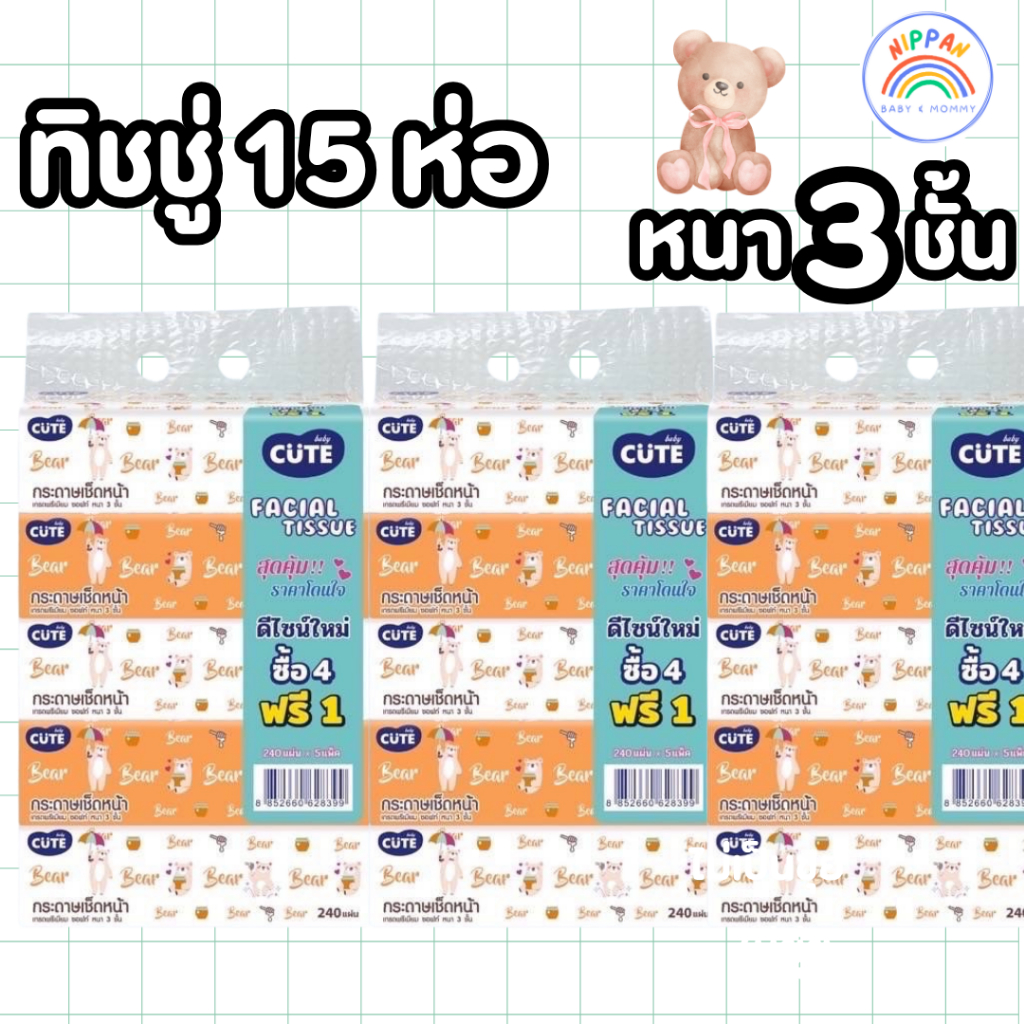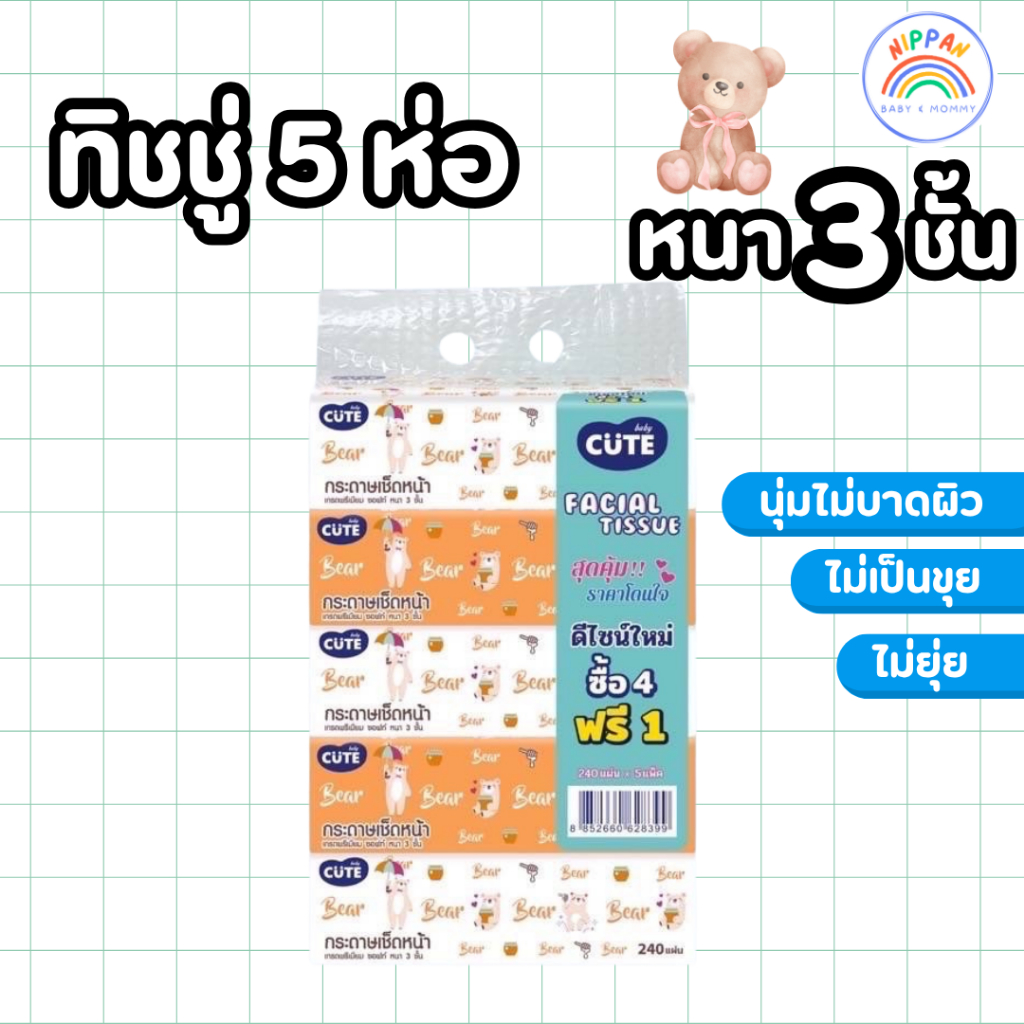 Baby Cute 3 แพ็ค กระดาษทิชชูเช็ดหน้า หนานุ่ม 3 ชั้น เนื้อกระดาษคุณภาพดี ไม่เปื่อยยุ่ยง่าย ซึมซับได้ดีเยี่ยม 1 แพ็ค 5 ห่อ