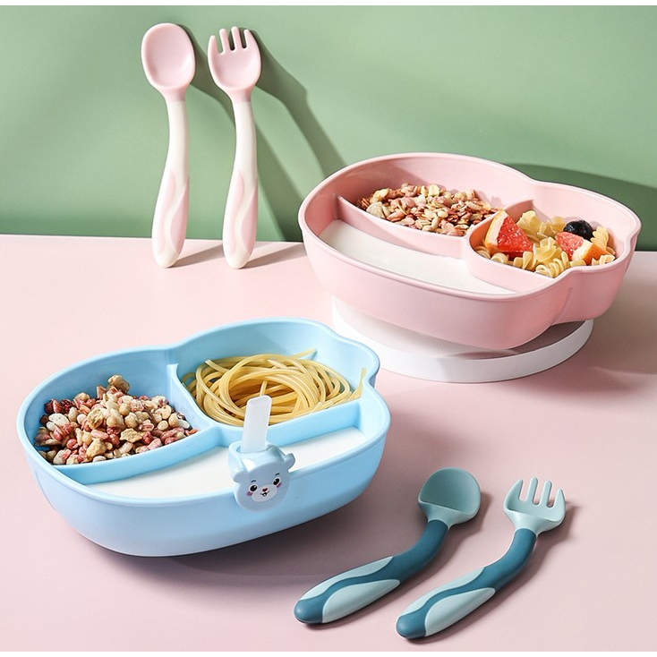 จานข้าวเด็ก (Ab91) - เซ็ตจานข้าวก้นดูด 3 ช่อง พร้อมฝาปิด+ช้อนส้อม+หลอดดูดซุป