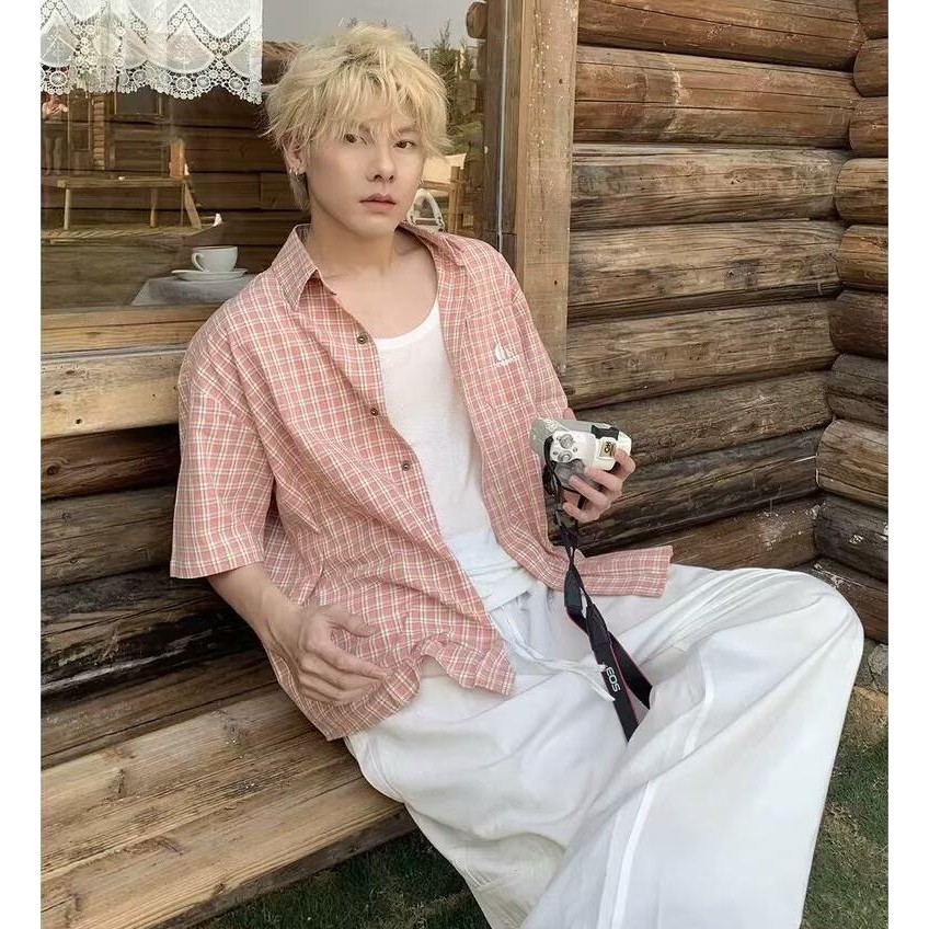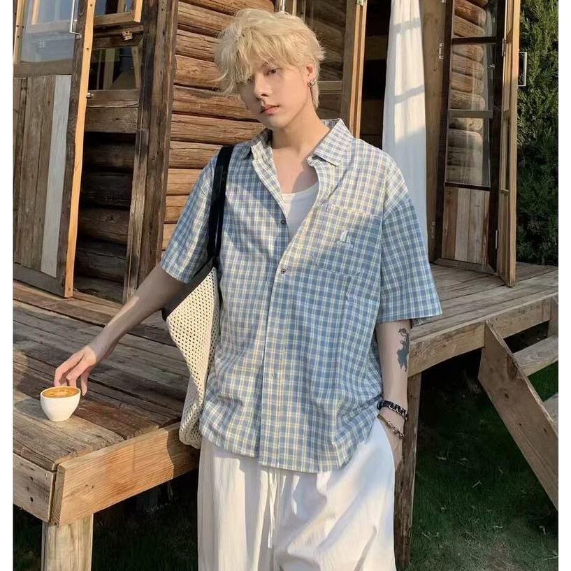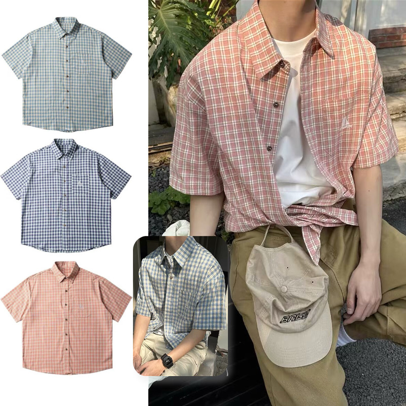 พอล ฟิตเซราลด์ ใหม่เสื้อลายสก๊อตแขนสั้นแฟชั่นอเมริกันย้อนยุคหลวมสบายๆคุณภาพสูงสไตล์เป็นกลาง