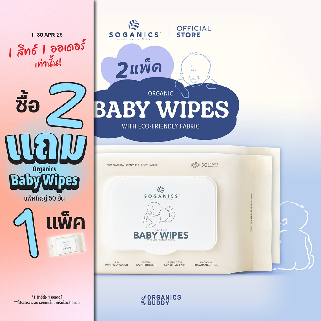 [2 แพ็ค] SOGANICS Organic Baby Wipes (50 Sheets) คุ้มกว่า ทิชชู่เปียก ผ้านุ่มละมุนจากใยธรรมชาติ 100%