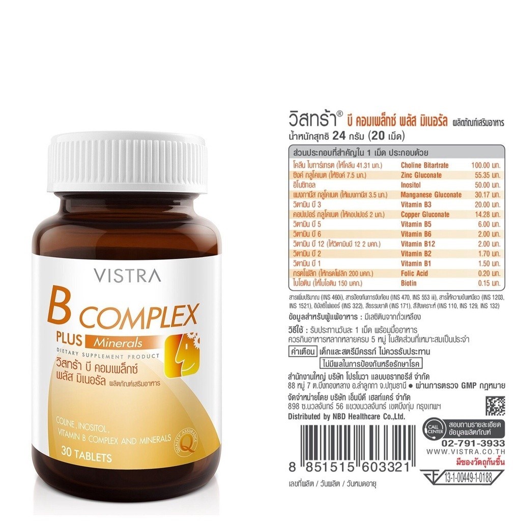 Vistra B-Complex Plus Minerals วิสทร้าวิตามินบีรวม (30เม็ด)